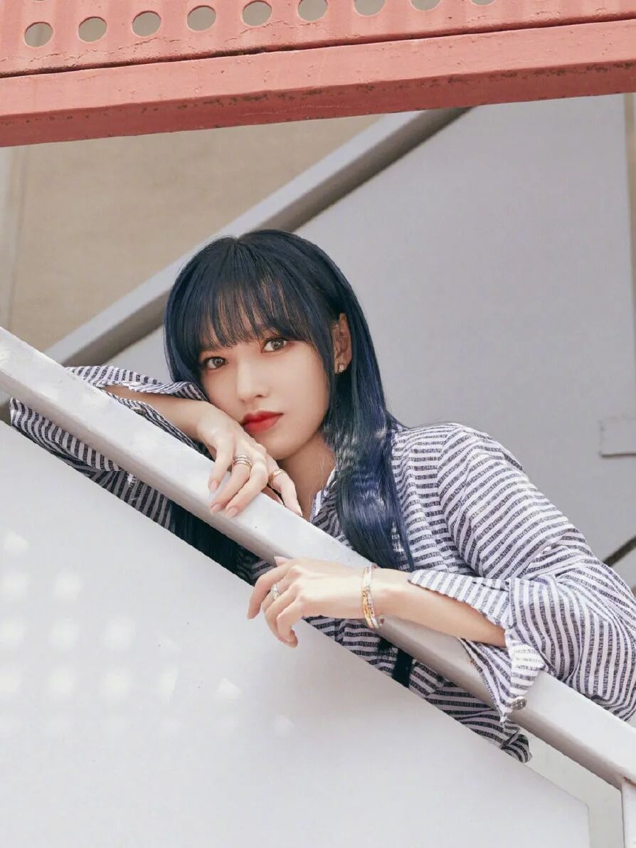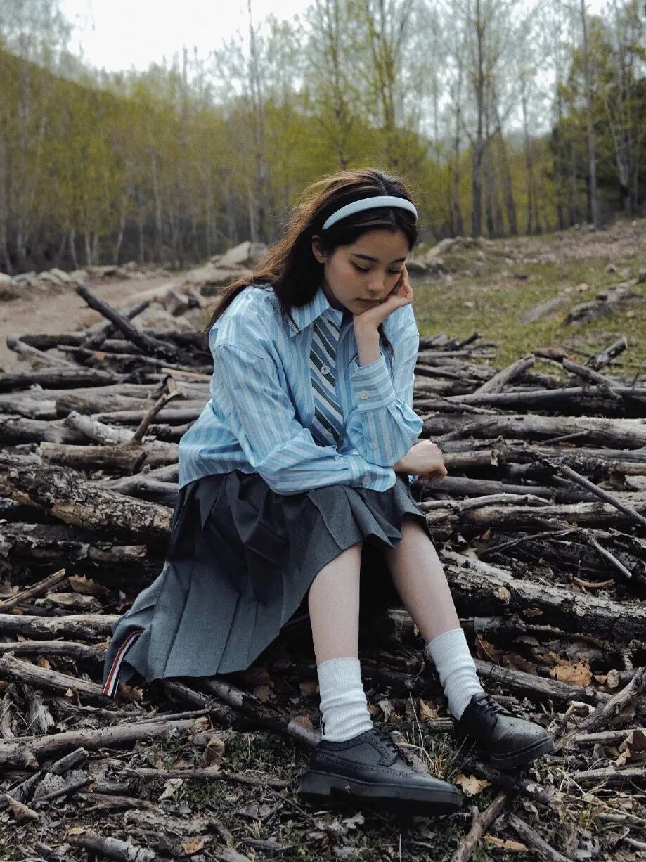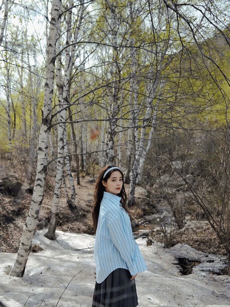 而且条纹衬衫的可穿性是不输白衬衫的!像是欧阳娜娜的这身look,就用蓝白条纹衬衫搭配灰色百褶半裙,清新甜美,学院感扑面而来,超级减龄。