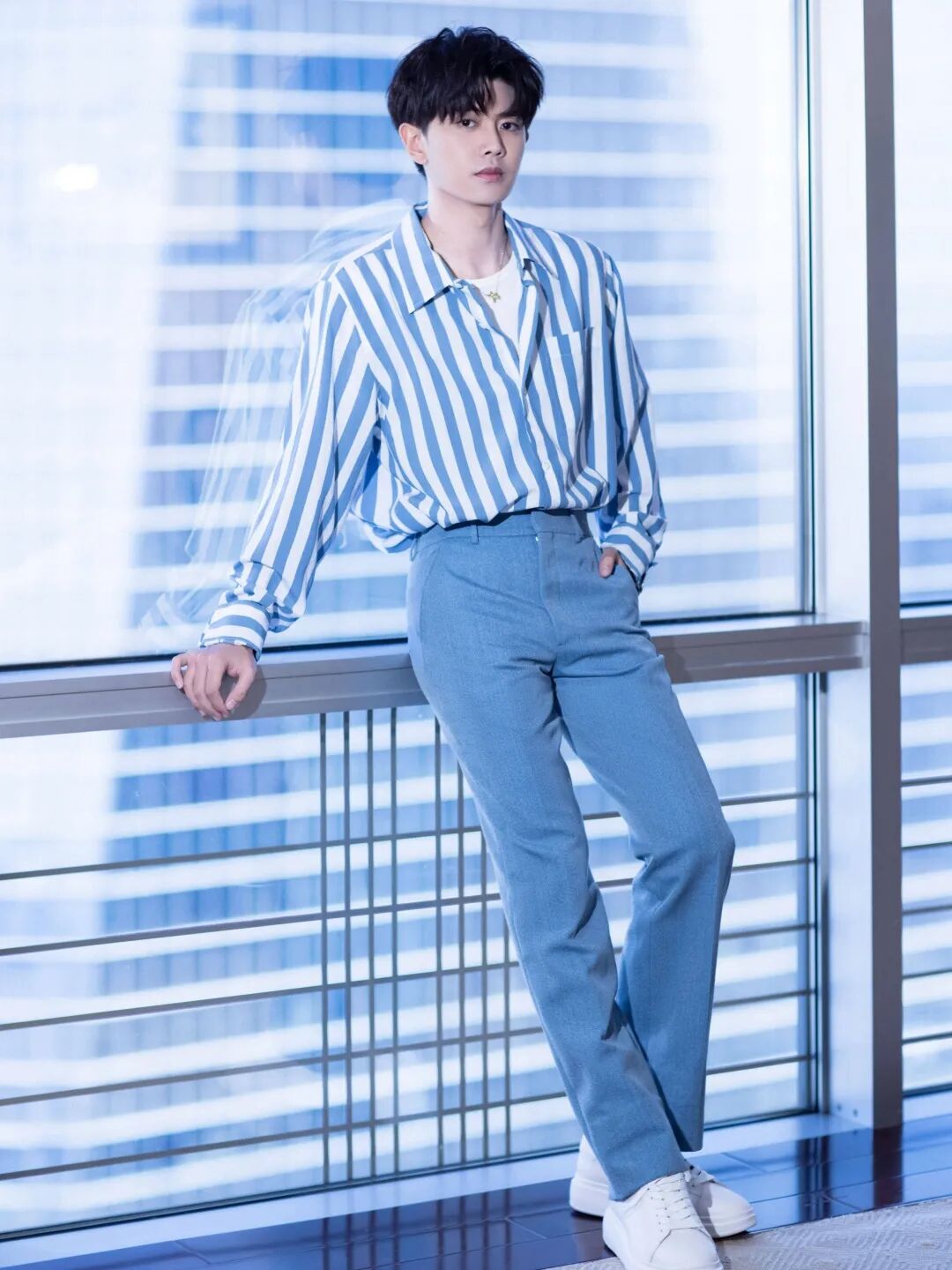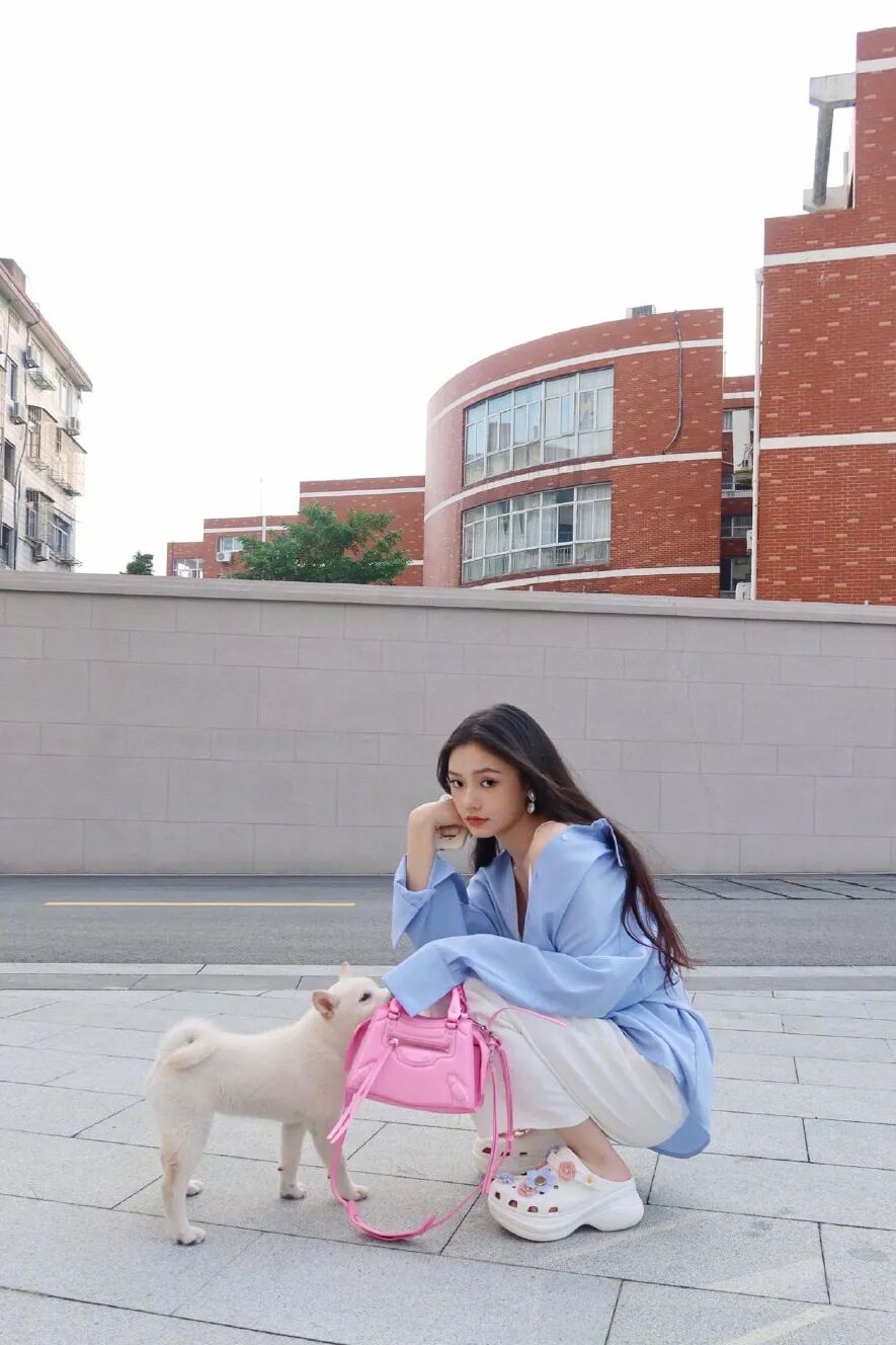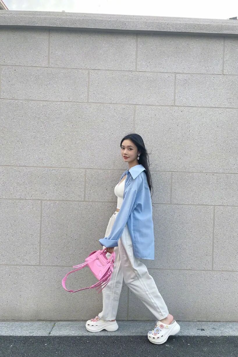 蓝色也是不错的选择,自带清新干净的气质。和林允一样,随便搭配白色裤系阔腿裤,就能营造出活力又不失时尚的少女感。