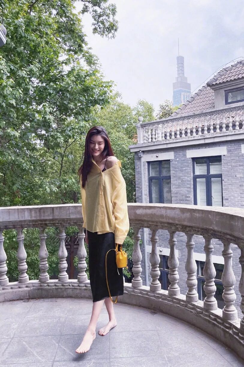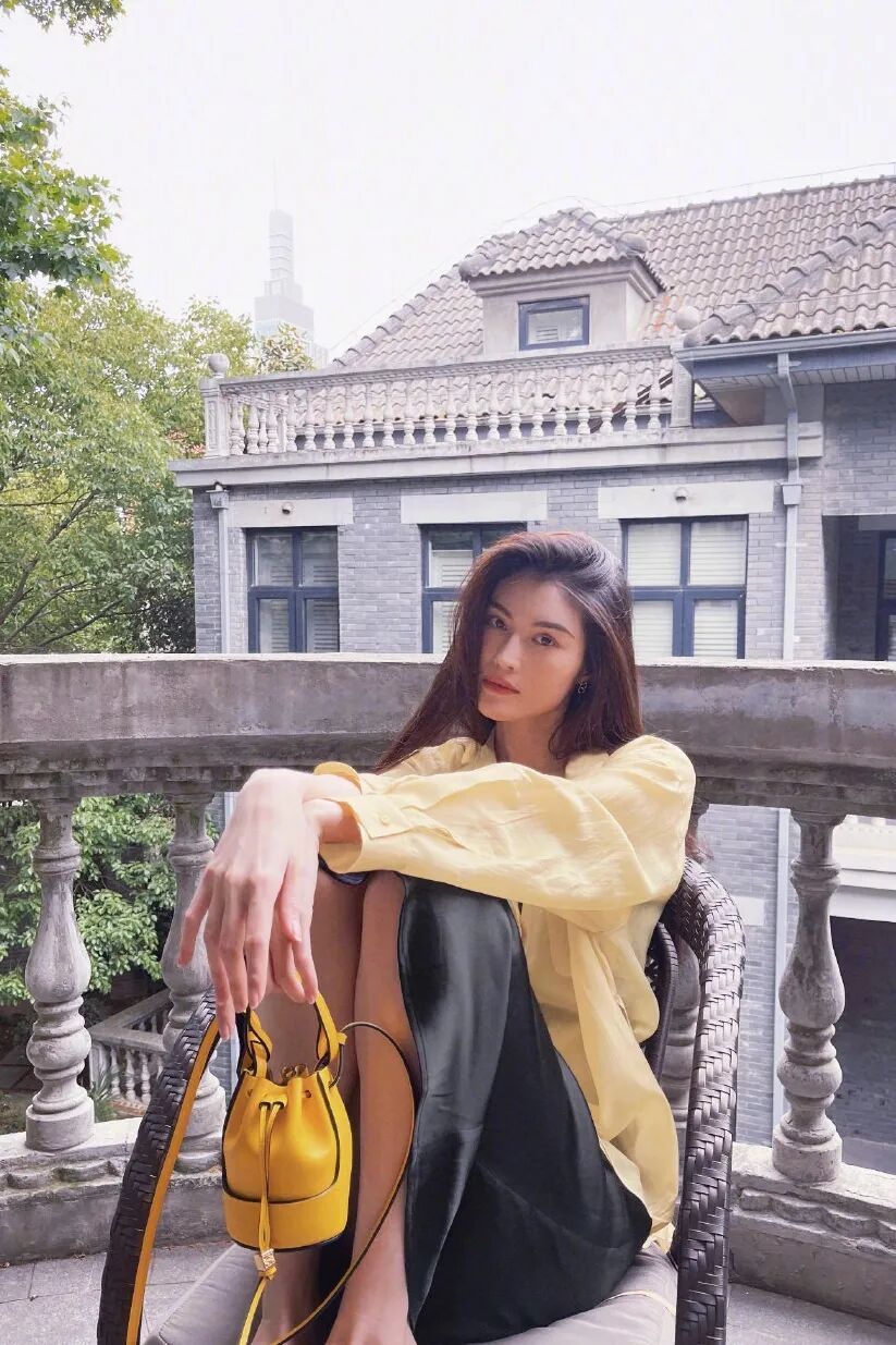 如果想要自己的穿搭更加吸睛,那么彩色也是不错的选择。何穗这身淡黄色衬衫搭配上吊带裙的组合,简洁而优雅,轻松展现恰到好处的慵懒感。