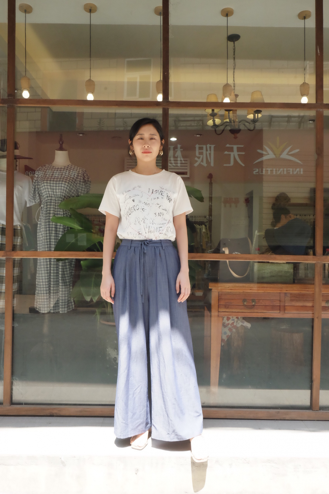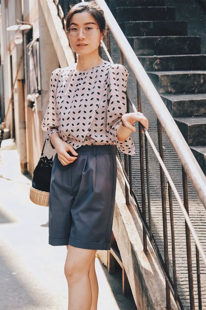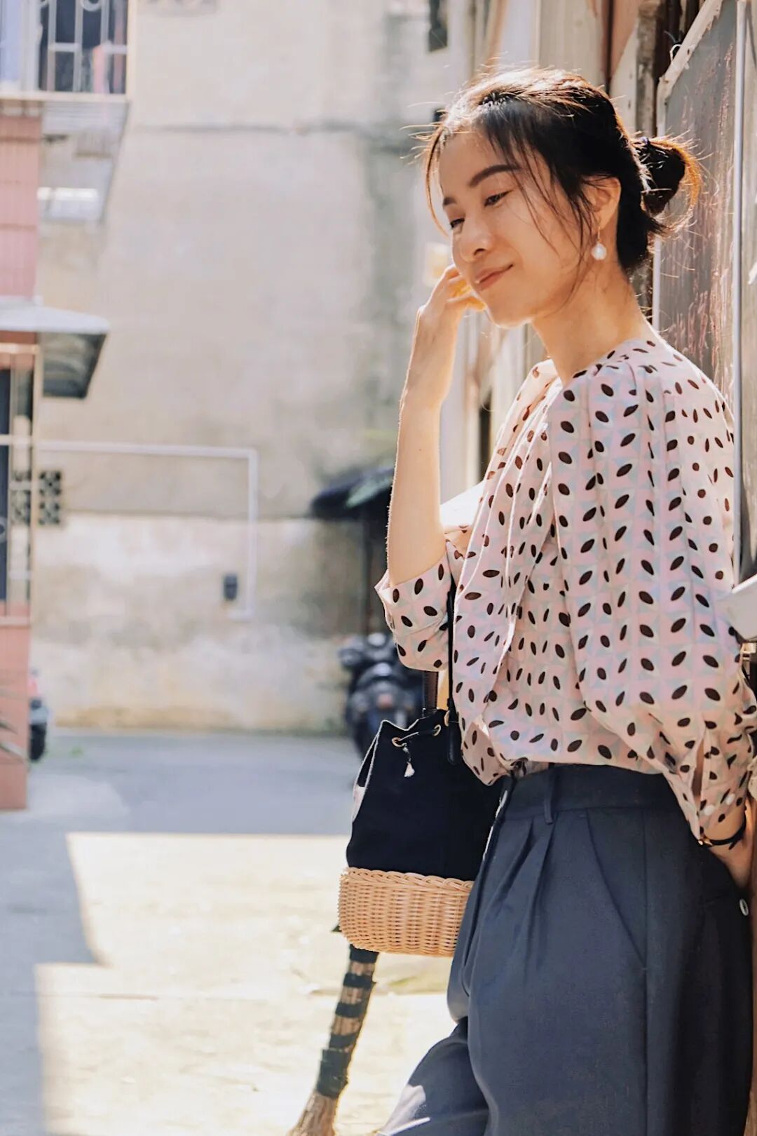 于是给自己选了一件肩袖有膨胀设计的花色上衣,搭配一条面料和颜色看似简单,但质感超好的西装中裤。