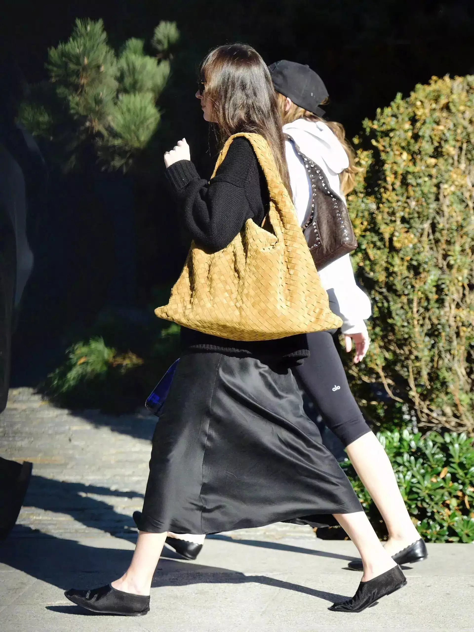 黑色针织衫搭配黑色半身裙,不同材质混搭作为时尚界备受瞩目的对象之一,达妹 Dakota Johnson 凭借其独到的审美眼光及卓越的服饰搭配技巧闻名遐迩。