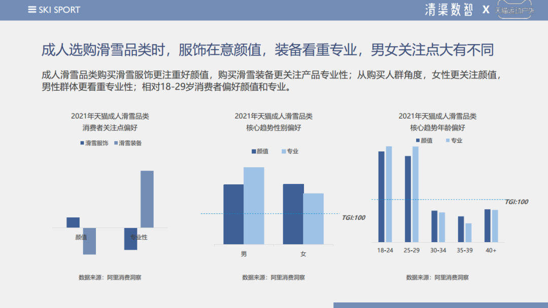 第三,成人专业升级、需求一体。不论滑雪水平高低,想要拥有自己全套装备的滑雪者比例,远远高于过去的几年。但具体而言,消费者在购买滑雪相关商品时有不同的侧重点:购买滑雪服饰时更在意颜值,购买滑雪装备时更在意专业。此外,初学者一般从功能服装类和护具品类开始购买,11月底开板节点下,超级品类日抓住时机,验证了此类消费者需求快速增长,而在喜欢上这项运动后,他们往往会购买更贵、更专业的商品。