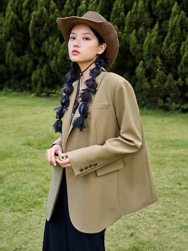 你日常买衣服的时候,一定要找那种材质比较紧实挺阔的面料,比如厚实的衬衫面料、西装面料,用你的骨架把它硬挺地撑起来,再人为造一个腰线,会更有气场一些。这类衣服穿好了,大概率会比小骨架的人穿上还要好看↓