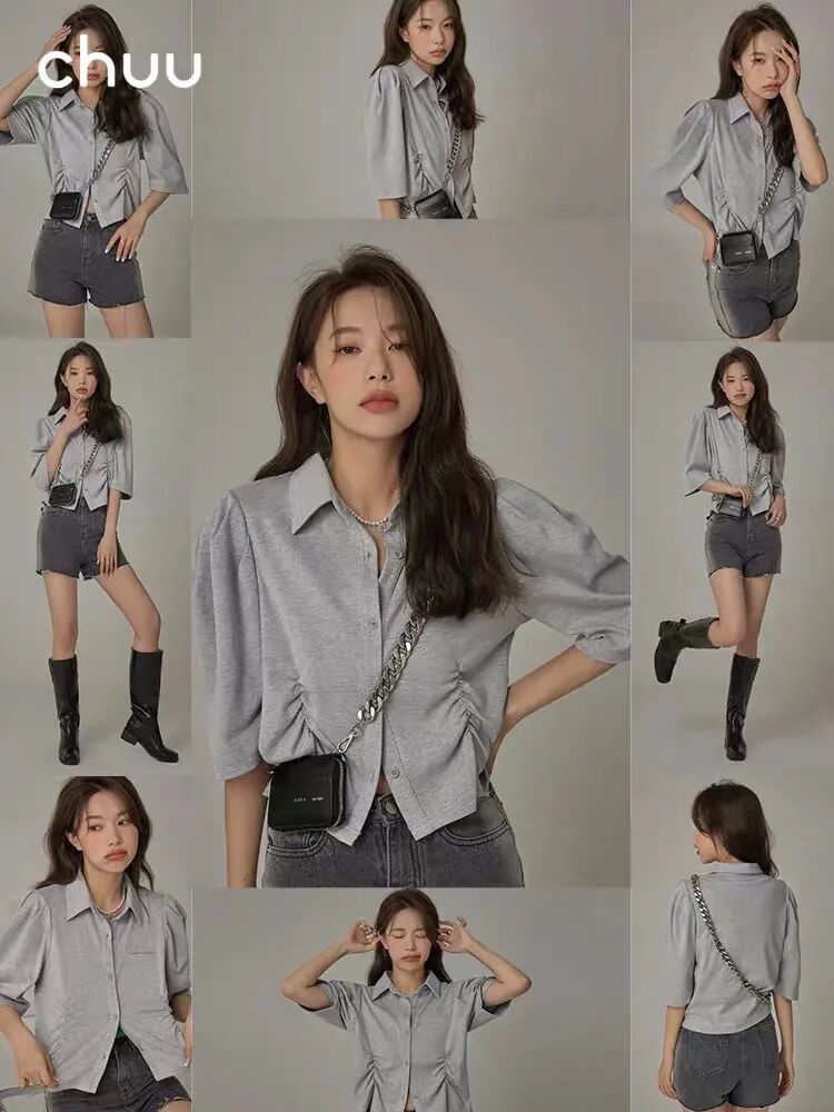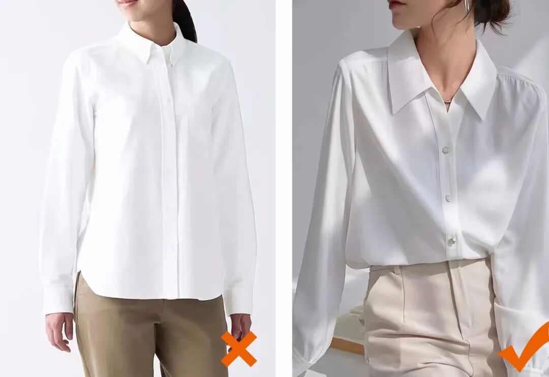 真喜欢衬衫的话,可以挑这种材质软一些的,即便开了领口,也会很自然地垂下来,更能修饰脸型和身材↓