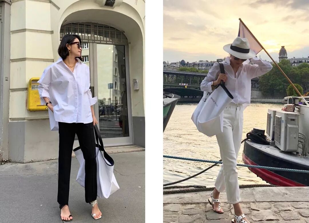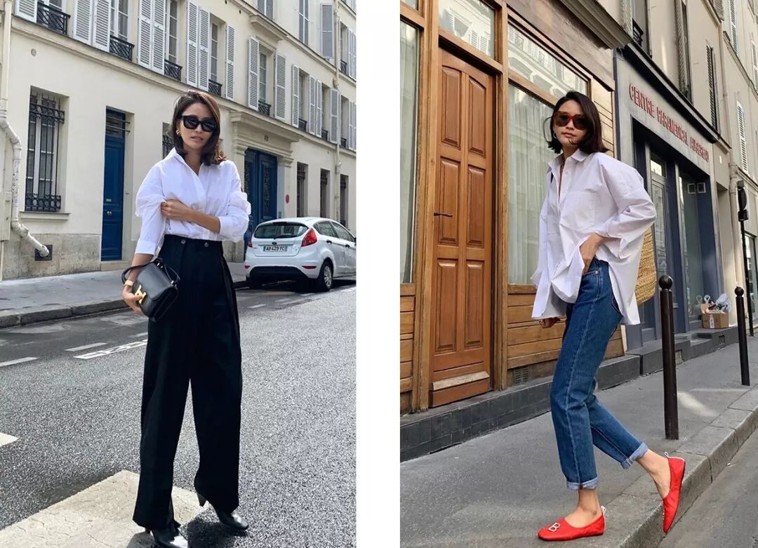 她平时爱穿的单品基本都是基础百搭款,没有多少设计细节,但会更注重衣服的版型和质感。比如白衬衫,她爱穿的就是我常说的oversize款式,像是从男朋友衣柜里偷来的,无论搭阔腿裤还是牛仔裤都大方好看。▼