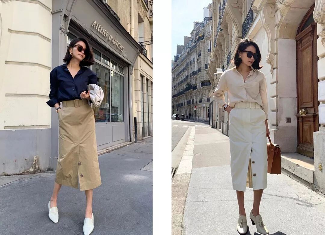 衬衫搭配面料硬挺点的直筒裙,会更适合上班族模仿,像她一样选带开衩设计的,行动更方便,走路步子可以迈得更大哈哈。▼