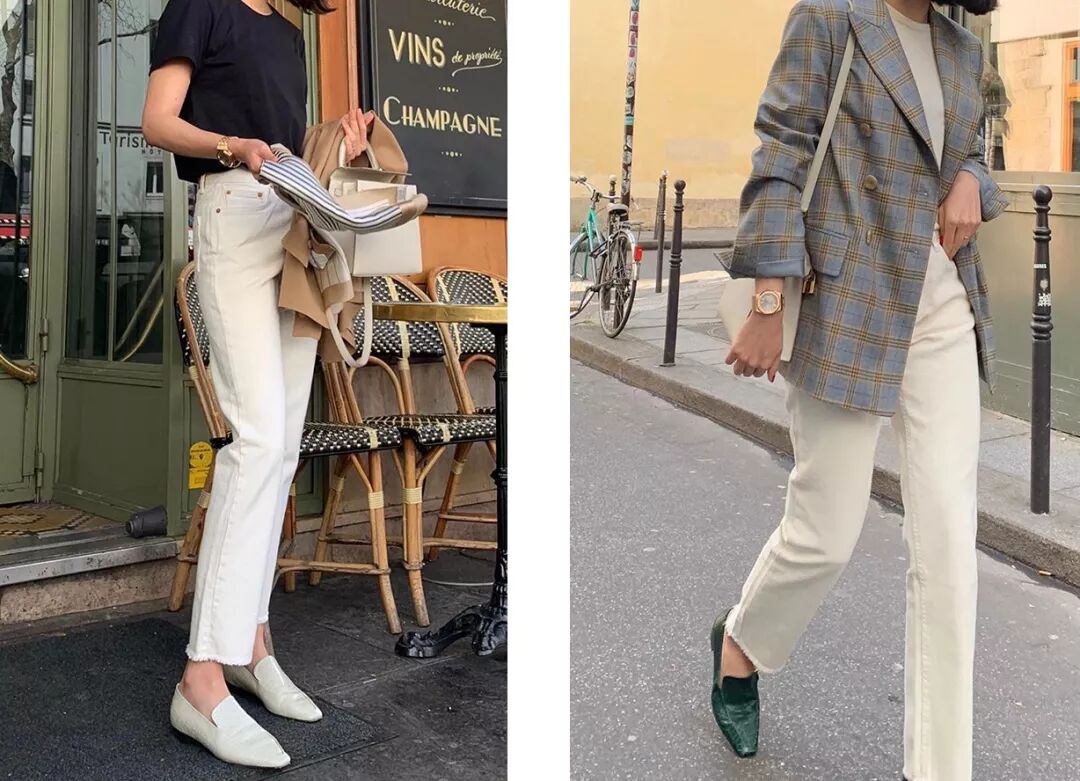 她的乐福鞋还蛮多的,和西装一样,颜色也都是中性色彩,白色款相对利用率会更高一些。穿裤装搭配乐福鞋时,记得一定要露脚踝哦。▼