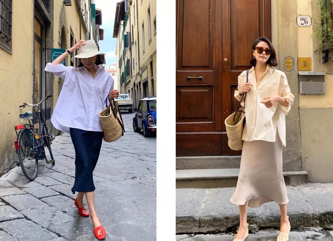 衬衫不一定都要扎进去穿,像她这样搭配贴身一点的真丝裙,慵懒又有女人味。▼