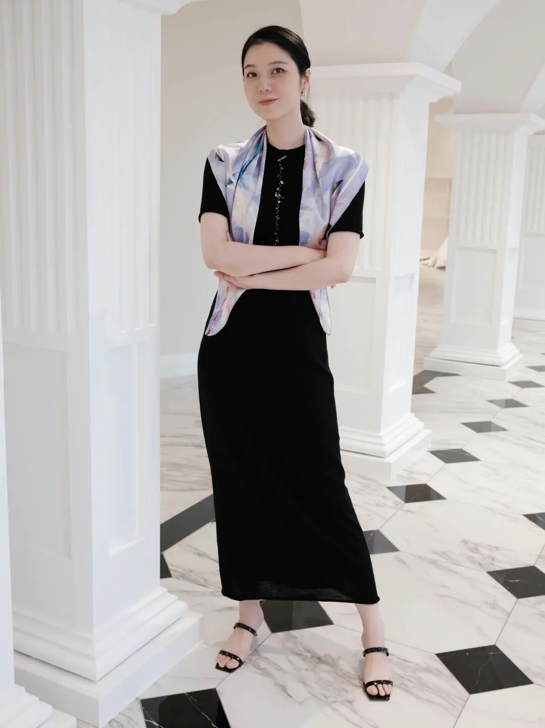 上衣与裙子一繁一简的对比,能够让人把视觉重心更多地放在上半身,从而在视觉上起到增高效果。这是穿搭里的一个“小心机”,毕竟造型的视觉比例是很重要的。