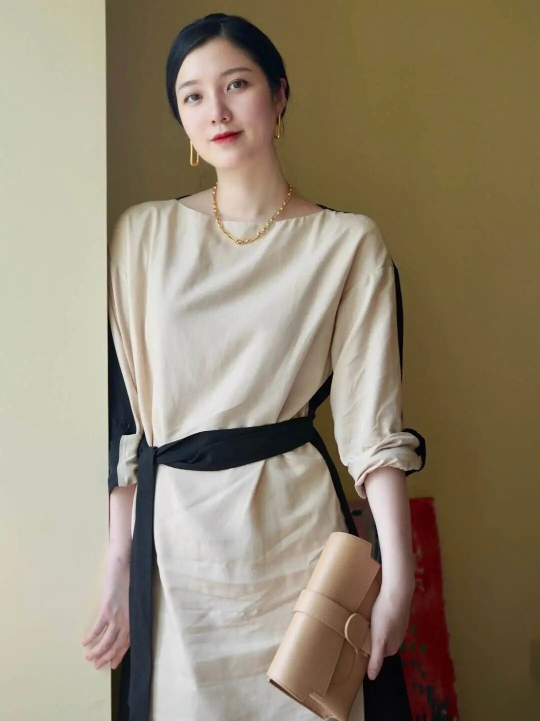 宽松版型的连衣裙,更有慵懒和随意的感觉。有时候我会配上一根腰带,打造出腰际线,更好地表现出身材比例。