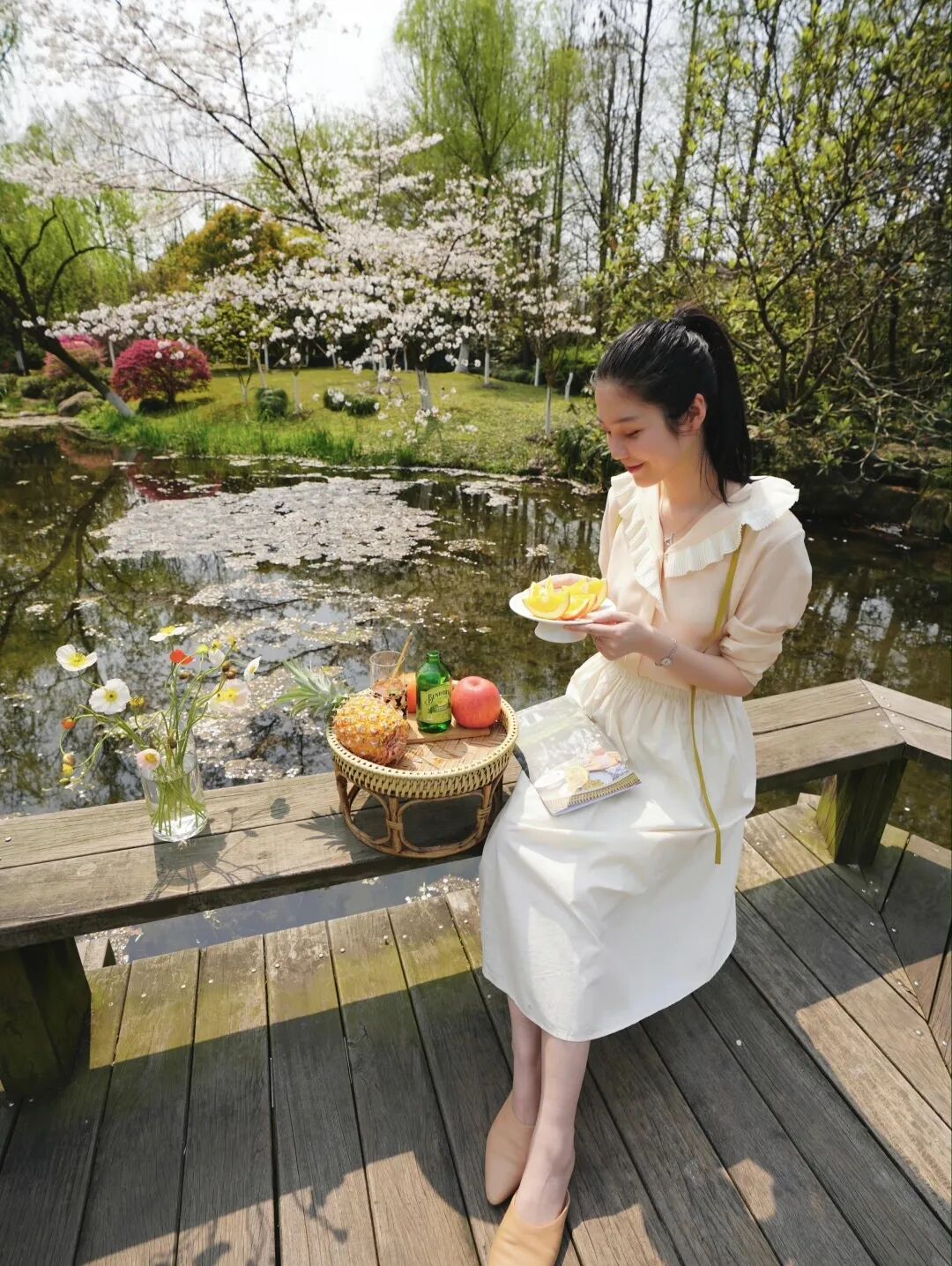 自然垂下的的裙摆,没有多余的版型设计,便已经显得万分自然。到小腿便戛然而止的裙身,将一小截纤细笔直的小腿露在外面,显得更是温柔甜美。