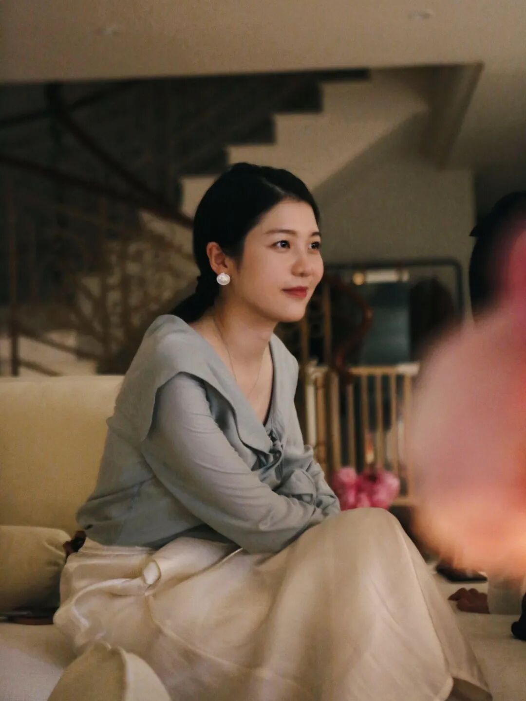 这条蓝色的绸缎裙在光照下,覆有一层莹莹光泽。如朱玉一般,润泽内敛;又如阳光下的水面,波光粼粼。仅是看着,它从中透出的温雅便让人心生欢喜。