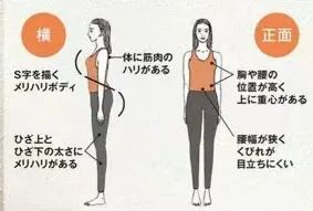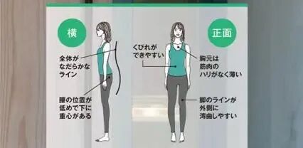 正面:脖子相对身高偏短,到肩膀的距离也短,锁骨不明显,腰线偏高。膝盖骨小,大腿粗、小腿细。