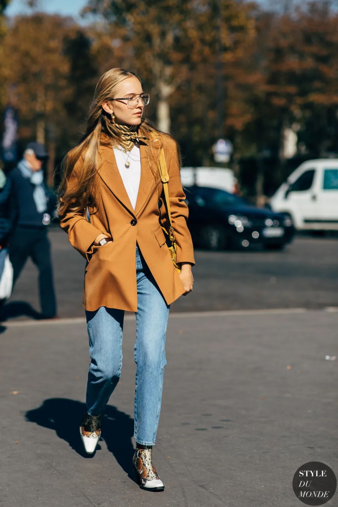 像时尚造型师Alexandra Carl这样,将一条亮橙色小方巾微微露出,成为整个造型的亮点,抢眼的亮橙色映照着她的脸庞,看上去精神抖擞。