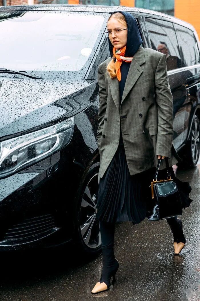 用丝巾包头的方式强化时尚感,相比于其他搭配方法,头巾的风格更日常,偏度假风,适用于一些非正式场合,让西装的格调更丰富自然。