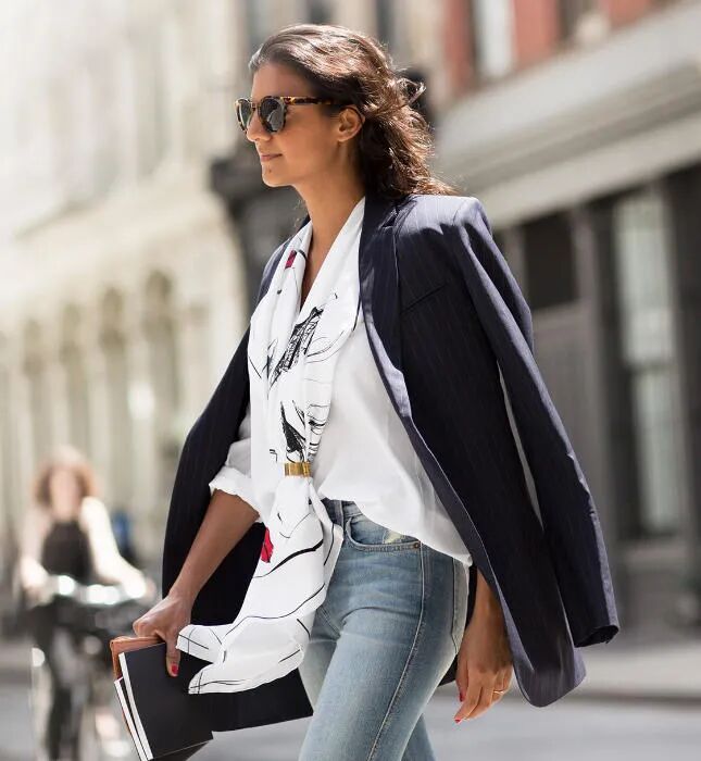 西装的使用场景也就不再拘泥于职场中,日常生活也可尝试西装,我们可以利用丝巾做灵活搭配。