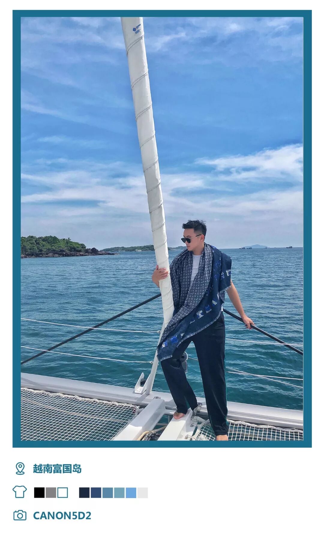 在东南亚度假的话,越南富国岛度假酒店就很不错,这里除了可以每天发呆,看夕阳品美食,还可以出去来个出海离岛游也是很棒的。坐在SARITA号上面去富国岛附近的小岛转转,就算什么也不做,就是单纯啥晒太阳也是Vacation里很迷人的部分。度假的话怎么舒适怎么穿,宽松的长裤,白T恤,加一略微民族风的纱巾就很适合拍照啦。