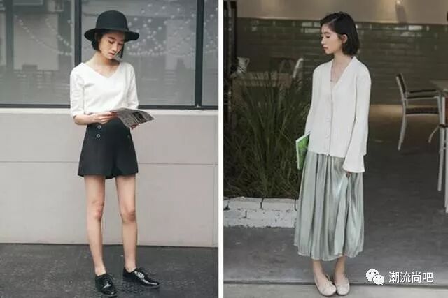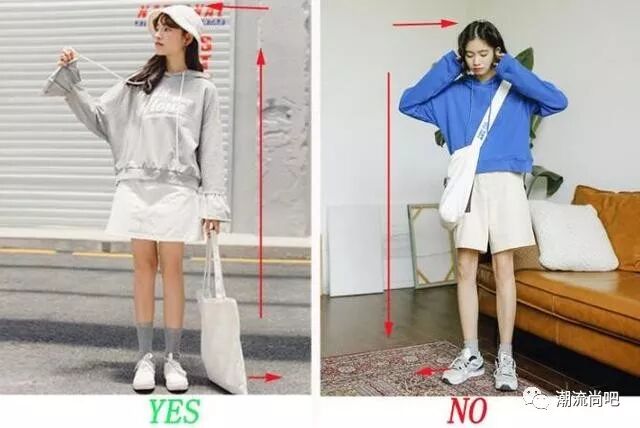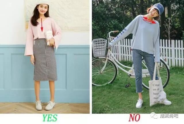 上面的两个图我们可以看出来左图的妹子巧妙的利用V领拉伸颈部线条的方法,视觉上拉高了我们整体的比例,而右图的妹子显得有点矮小,小圆领的穿搭横向的拉伸了整体视觉,不利于我们身材矮小的妹子来尝试哦。