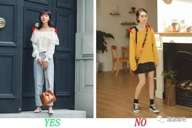 看上面的两个图,虽然适当露肤会吸引视觉,掩盖缺陷,但是“露”也要分怎么露,左图的妹子有效的拉长了颈部的线条,视觉吸引掩盖了缺点,右图的妹子是半露肩,由于肩带的阻碍没有起到拉伸身高的特点。