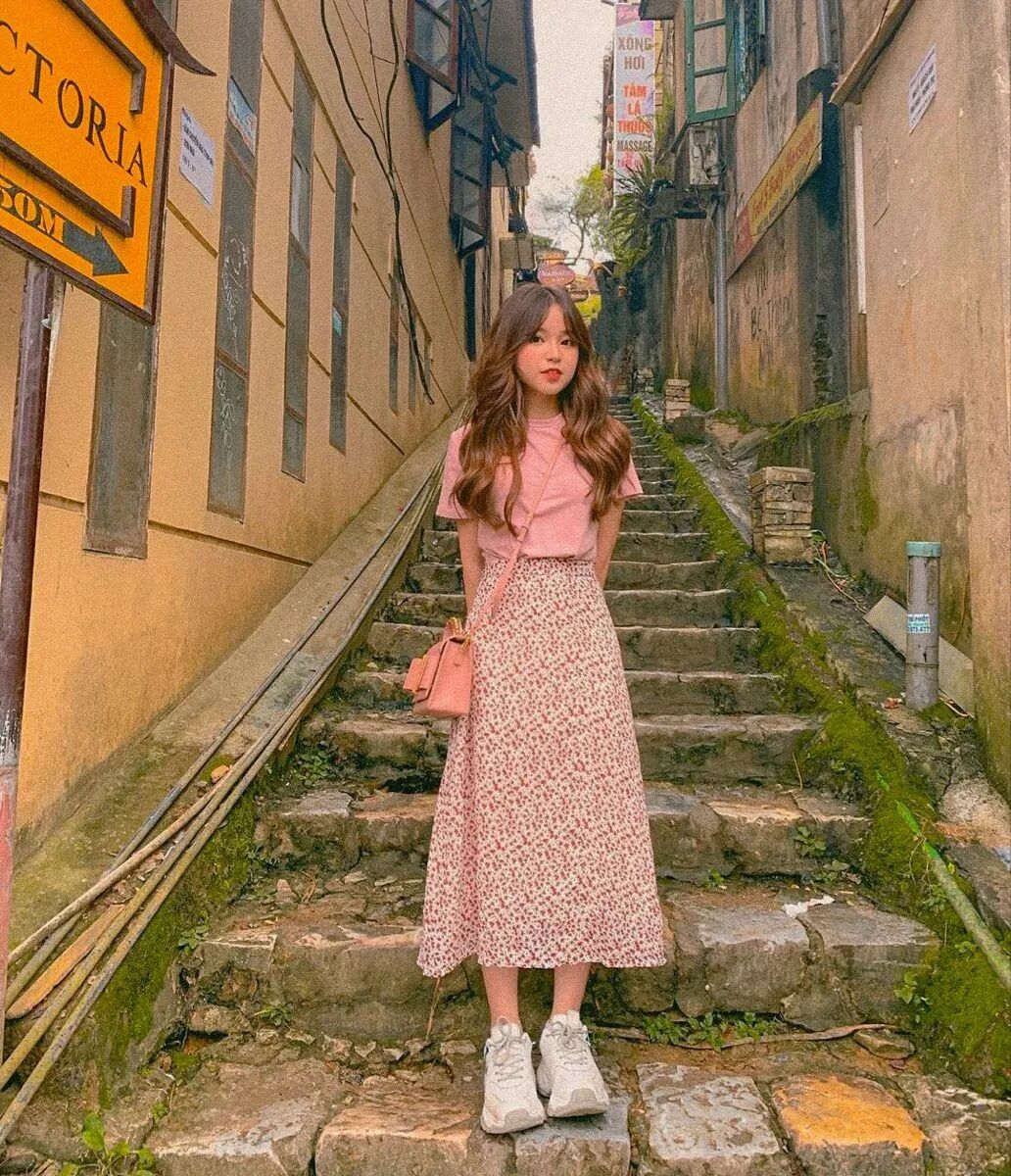 搭配撞色小碎花裙,也是采用粉色的设计,版型属于A字款。这样的穿搭既有少女感又不会单调,说实话比那些暗沉色的真的要好太多,简单配一双运动鞋也好看。