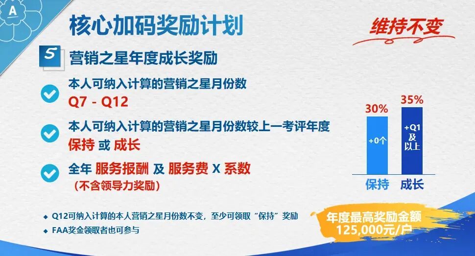 同一个财年,帮你的部门中(12组创办人高级主任部门,FAA64分)以上的级别,您即符合皇冠奖衔资格。因为你也符资深营销总监奖金、高级营销总监奖金、总监奖金、高级经理奖金、经理奖金、其年终奖金也可照领。当你做到皇冠,安利公司在年终再额外颁发你一项“皇冠单次奖金”人民币50万元。只要你还在不停发展安利事业,你还可以得到;销售佣金、领导奖金、红宝石奖金、明珠奖金。年收入500万元左右。安利专机接送到自己的旅游胜地彼得岛旅游,可带六位亲人,到安利总部与公司家族高层聚餐。其他同上。(六)后面还有创办人咨询委员!资深咨委!创办人资深咨委!这是安利事业中最高得奖衔。成为创办人成员,享受更高的待遇。当你成为皇冠大使的时候,你得年收入奖是8位数。上千万元前面得数字还不是1得时候,你可以得到多少人的尊重的得同时,你还可以鼓励多少人成功?没钱时,钱是追求,功成名就时可做多少有意义的事!在马来西亚有幸得到亲自接待傅后坚先生的机会,感受到有那么多人从心底尊重和感恩他,这份事业真的让我感觉到超越了金钱的价值……以上就是安利事业的9种12项奖金。了解了安利事业的奖金制度以后,大家可以会过头来看看从事安利事业,他可以锁定目标的事业,就象你在爬一栋大厦,你必须从一楼为起点,当你到了2楼的时候,你也知道你离目标有多远,这样的事业你还有什么顾虑?当然,在安利中还有很多无形的财富:如旅游、一个高级经理每年的旅游费大约在15万左右,夫妻双方即30万,四十岁上高级经理,到八十岁是四十年,即30*40=1200万,并且旅游也世袭,下一代照样出去旅游。除此还享有出各种版权、演讲待遇等等。当然,在安利中的成长、得到的健康、和睦的家庭、幸福的婚姻、美好的人际关系、被尊重被需要的价值、鲜花掌声和为国争光、光宗耀祖的荣耀这些都是用金钱无法衡量的!当然,如果你对此奖金还没有什么感觉,那么以上的9种12项就是毛毛雨了,其实安利真正的收入还在后面,前面是涓涓细流,后面才是惊涛骇浪,这就是为什么那些石油大亨,水果大王等亿万富豪,总裁级的人物包括军火商也来做安利的理由了。这就是FAA奖金,也称创业者奖金。FAA创业者奖金特别说明经过你的努力开拓,你的市场中出现了在一个财年的12月中,每个月都达标做到125000业绩的部门,称为Q12的DD,一个记1分,有多少算多少。出现一个经理部门记1.5分,出现一个高级经理部门记3分,这样累积,在同一财年若积分达到:积分奖金