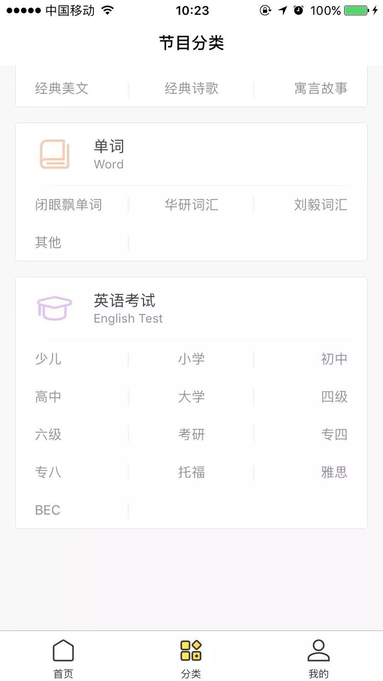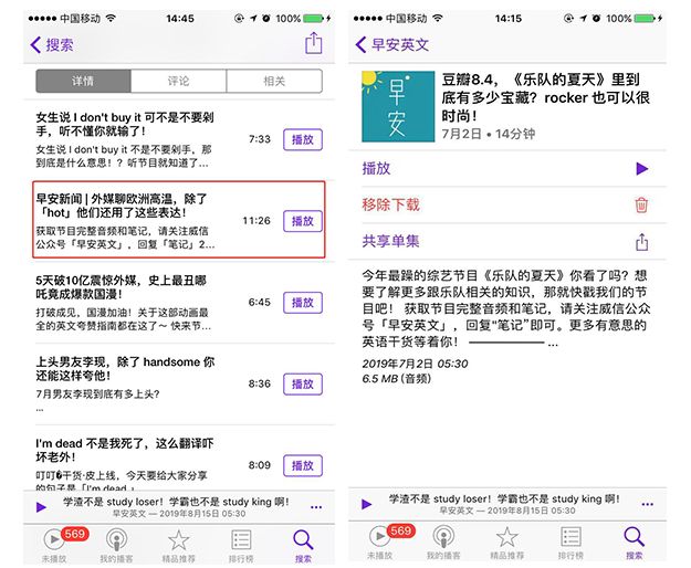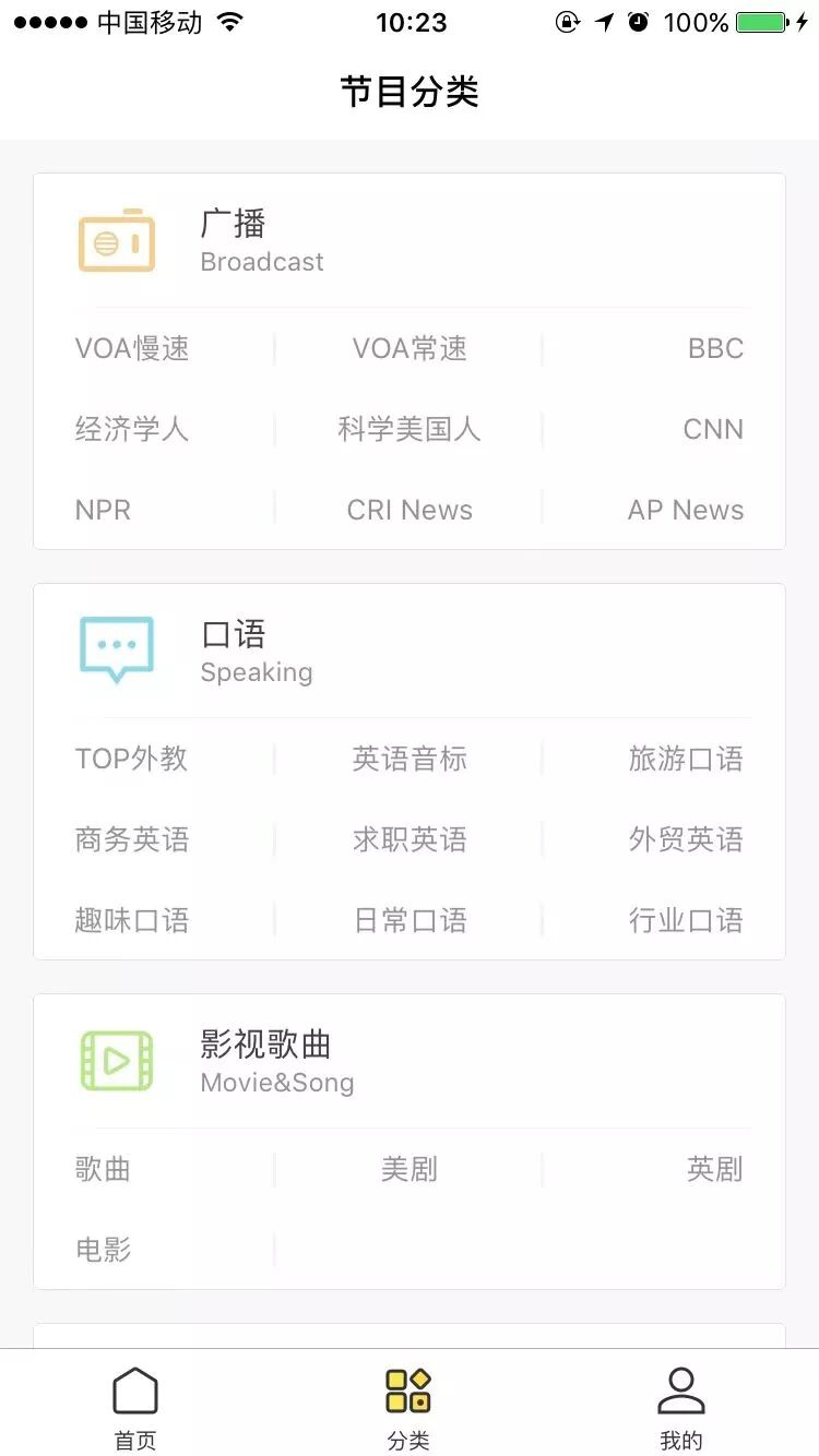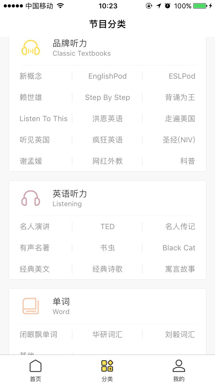可选择的内容非常多,不过刚开始想练习提升口语的话,非常推荐日常口语和旅游口语这两个节目,内容相对简单也比较好学,而且实用度非常高,平时练习也很容易实现场景化练习。另外学生党也可以学习TED的内容,及不同级别的单词,版面都非常清爽,笔记本功能相对比较激烈,只能充当收藏夹,还是建议配合纸质笔记本记录学习内容。