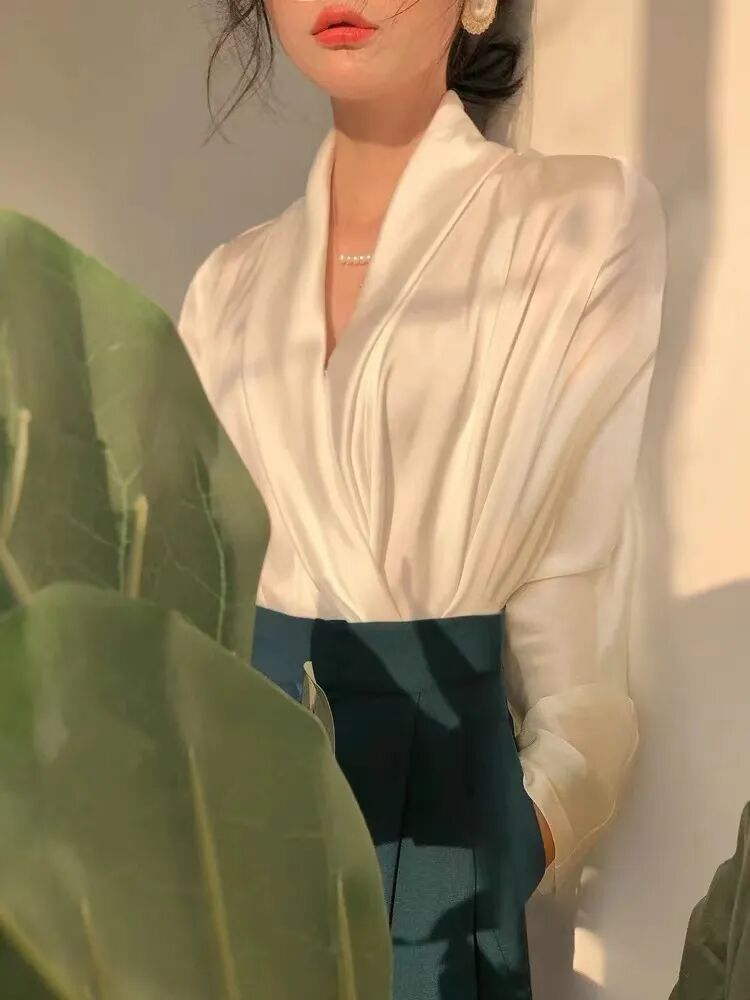 而白衬衫没有出彩的设计怎么行,今天为大家分享的搭配,选择了V领设计的白衬衫,上身后更多了份娇俏感,搭配通勤风的下装时,看上就去很有女人味。