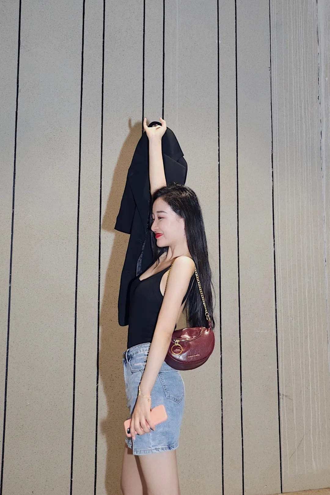 早晚稍凉时,穿上短袖西服(是的,是个一年四季都爱穿西服的宝宝),一秒变A✌️。整体颜色偏暗,用酒红色包包提亮一下,perfect~