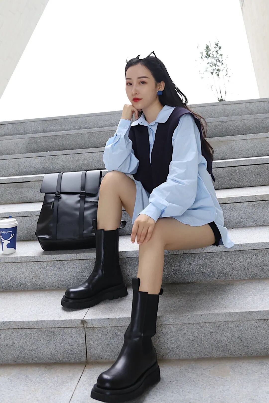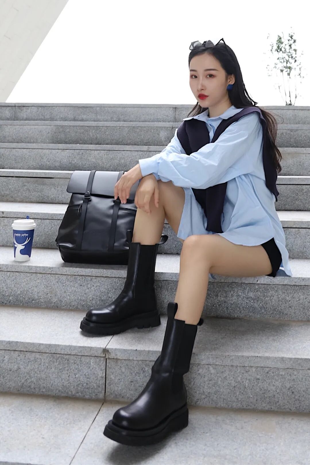 单独穿的话稍显单调,可以选择同色系披肩,深蓝+浅蓝的组合瞬间变得活力减龄,又有气质。搭配烟筒靴和皮质双肩包,更添一丝帅气~