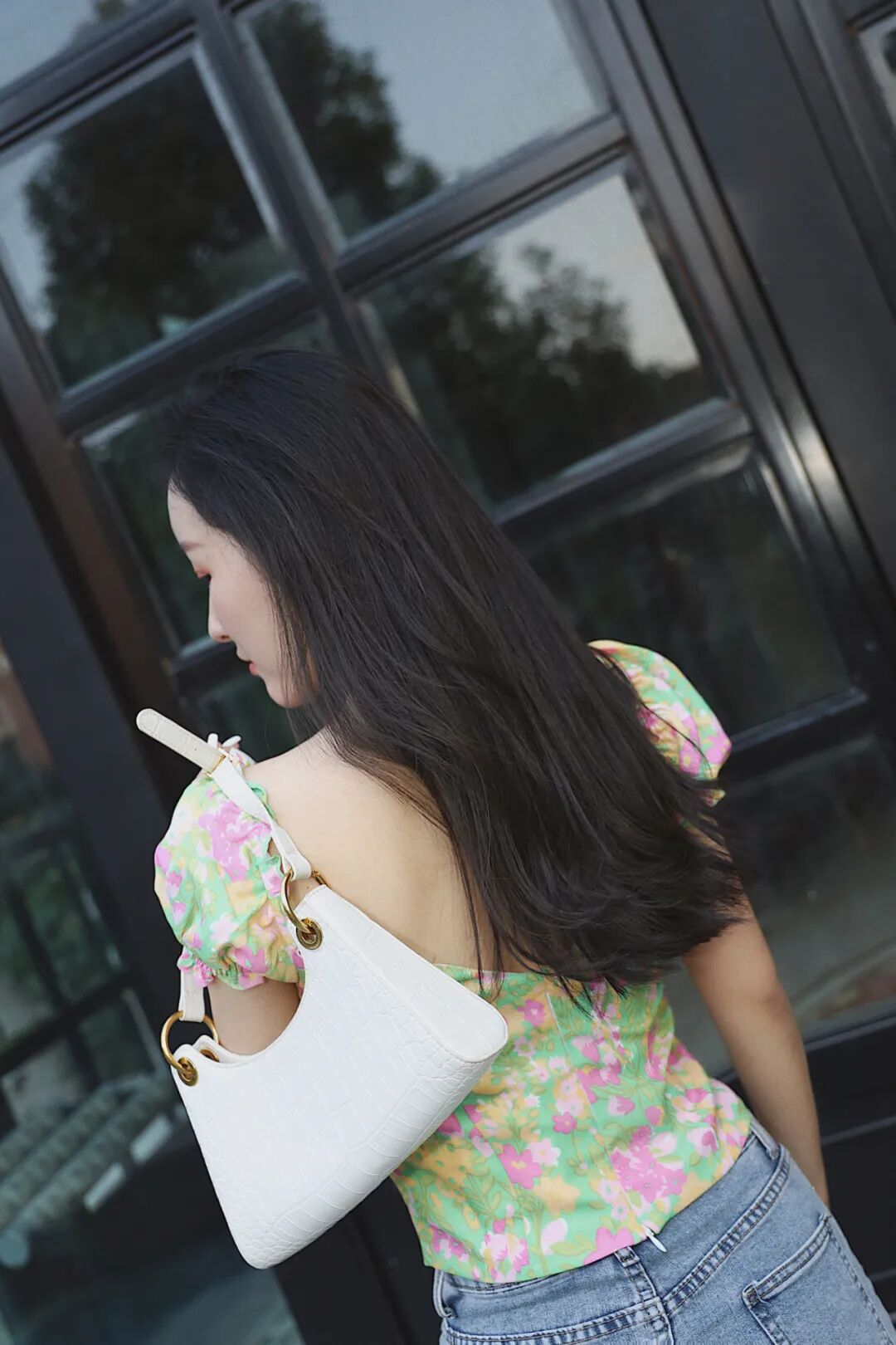 搭配白色腋下包和牛仔短裙,再用金色饰品来点缀一下,看起来更时髦,日常也可以穿~