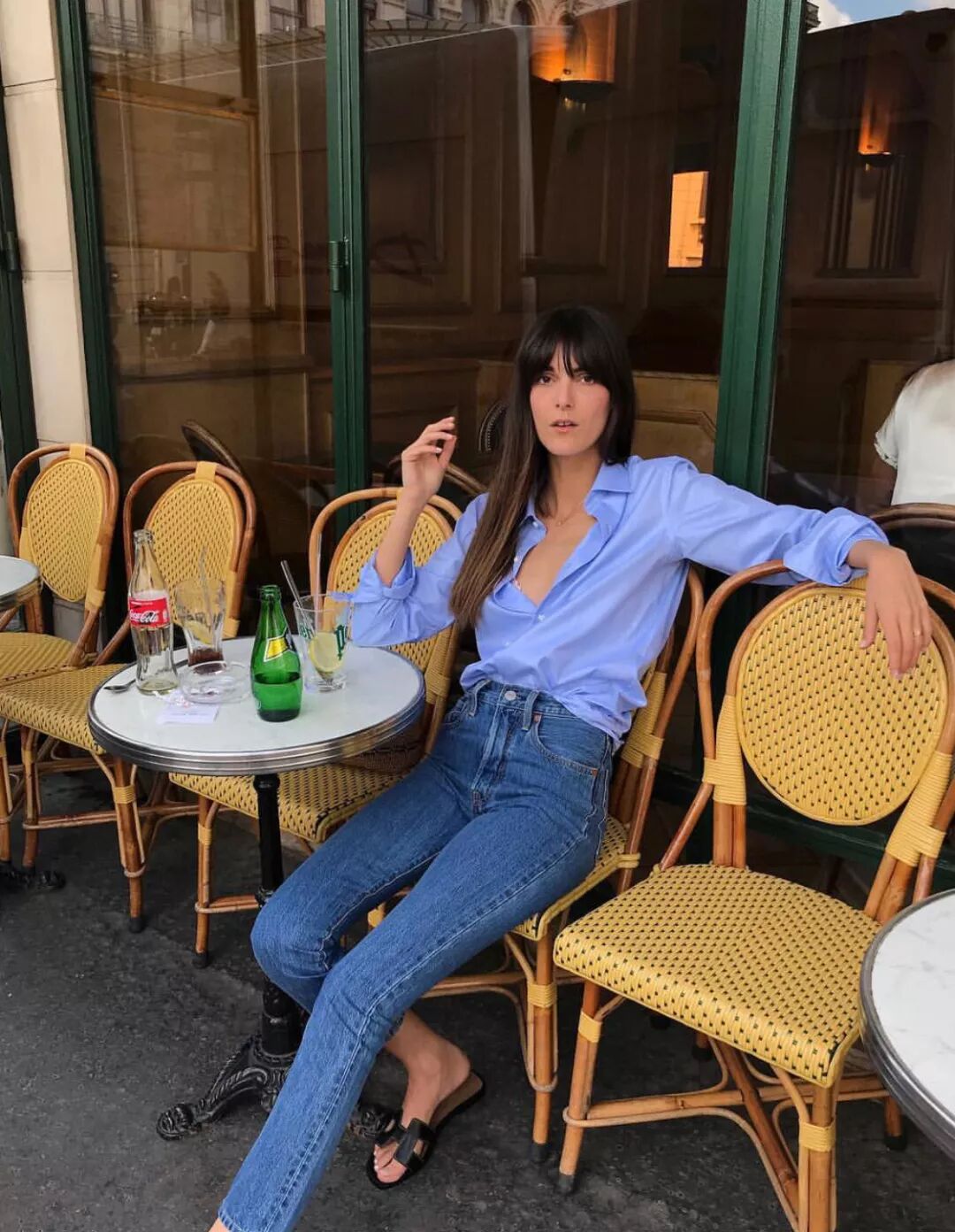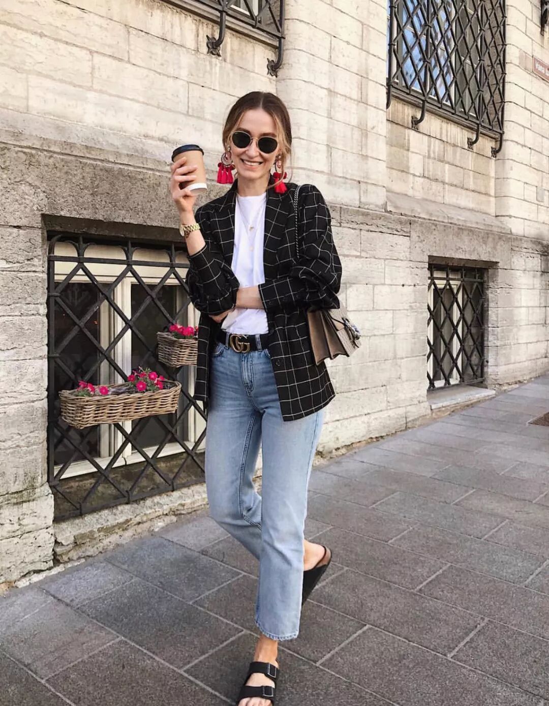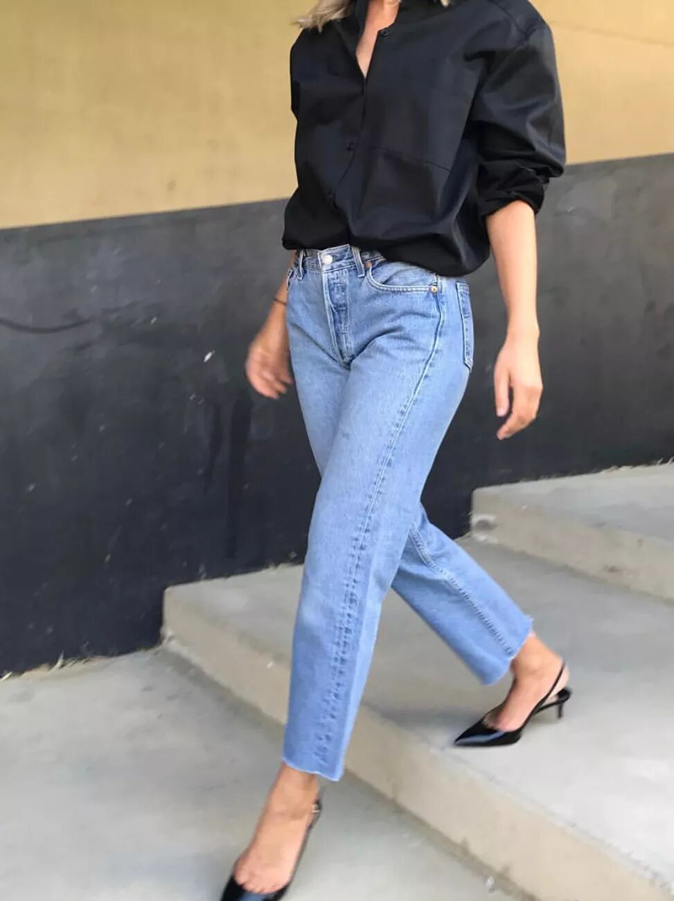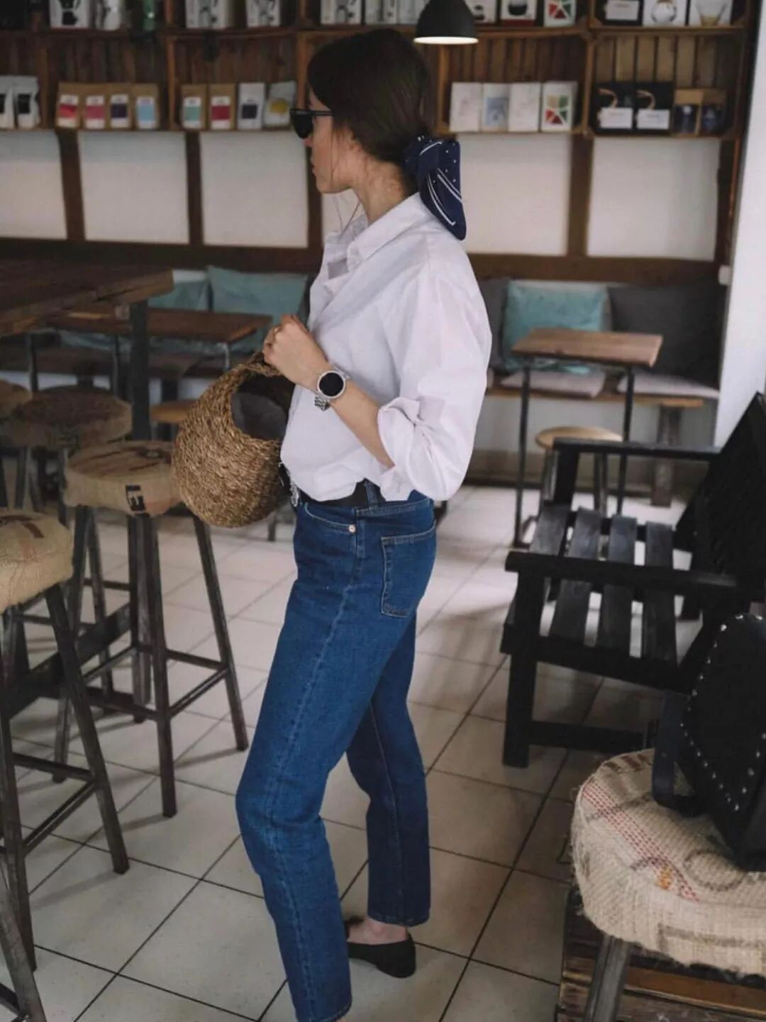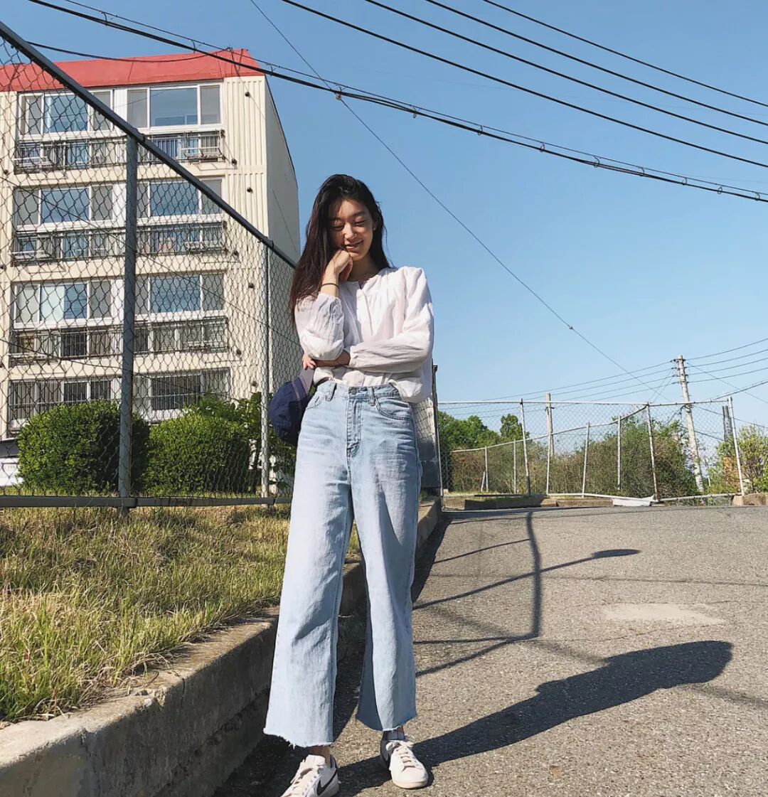 衬衫、T恤+牛仔裤+平底鞋,