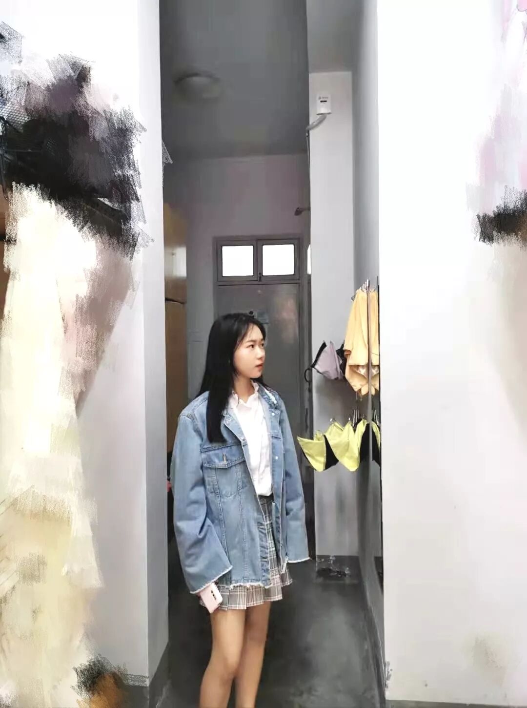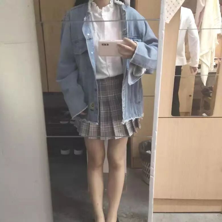 白色花边领内搭+蓝牛仔外套+灰色格纹百褶裙