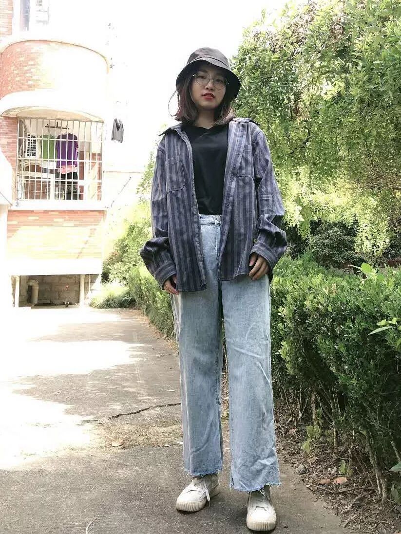 黑色内搭+蓝紫色条纹外套+高腰阔腿牛仔裤+黑色渔夫帽
