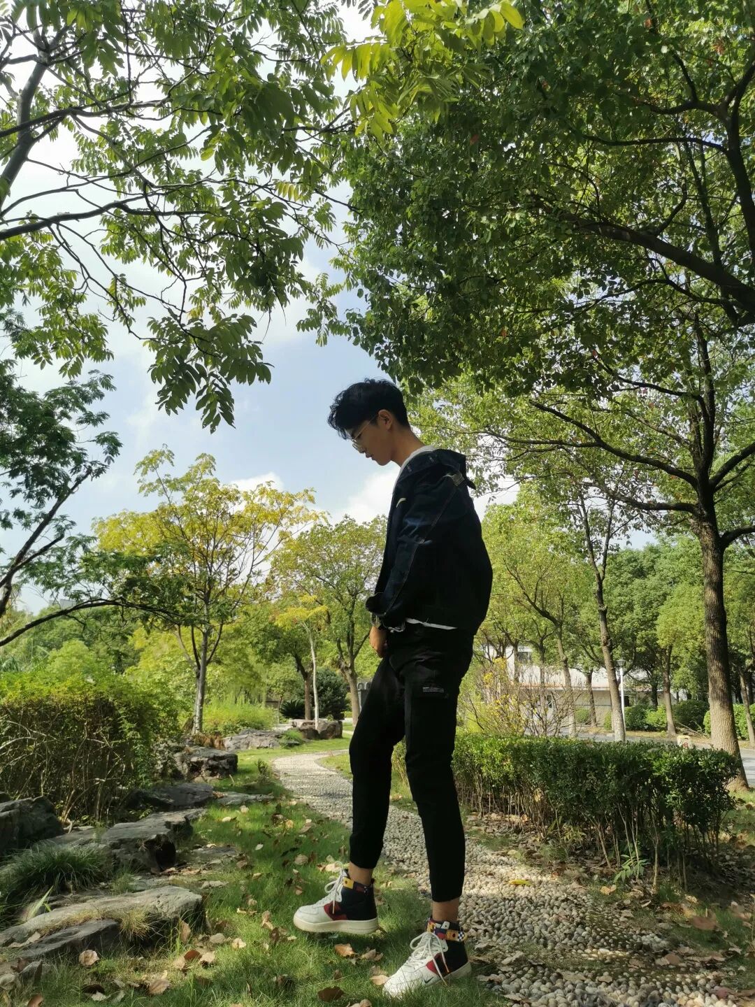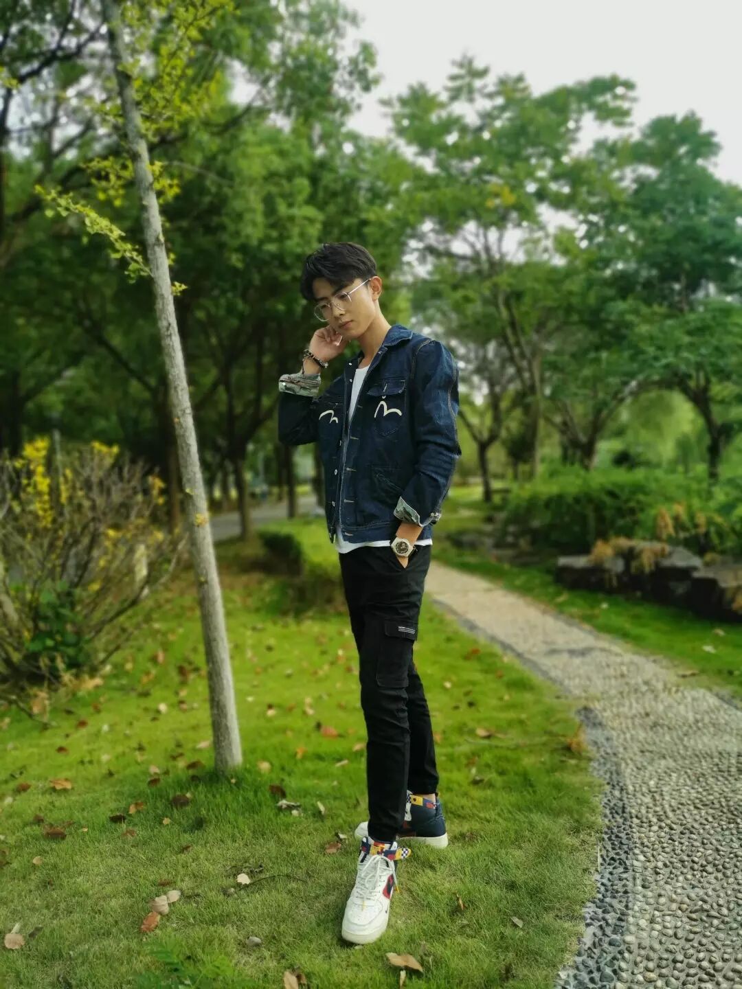 蓝牛仔外套+白色内搭+白色电子表+黑色工装裤+Nike Air
