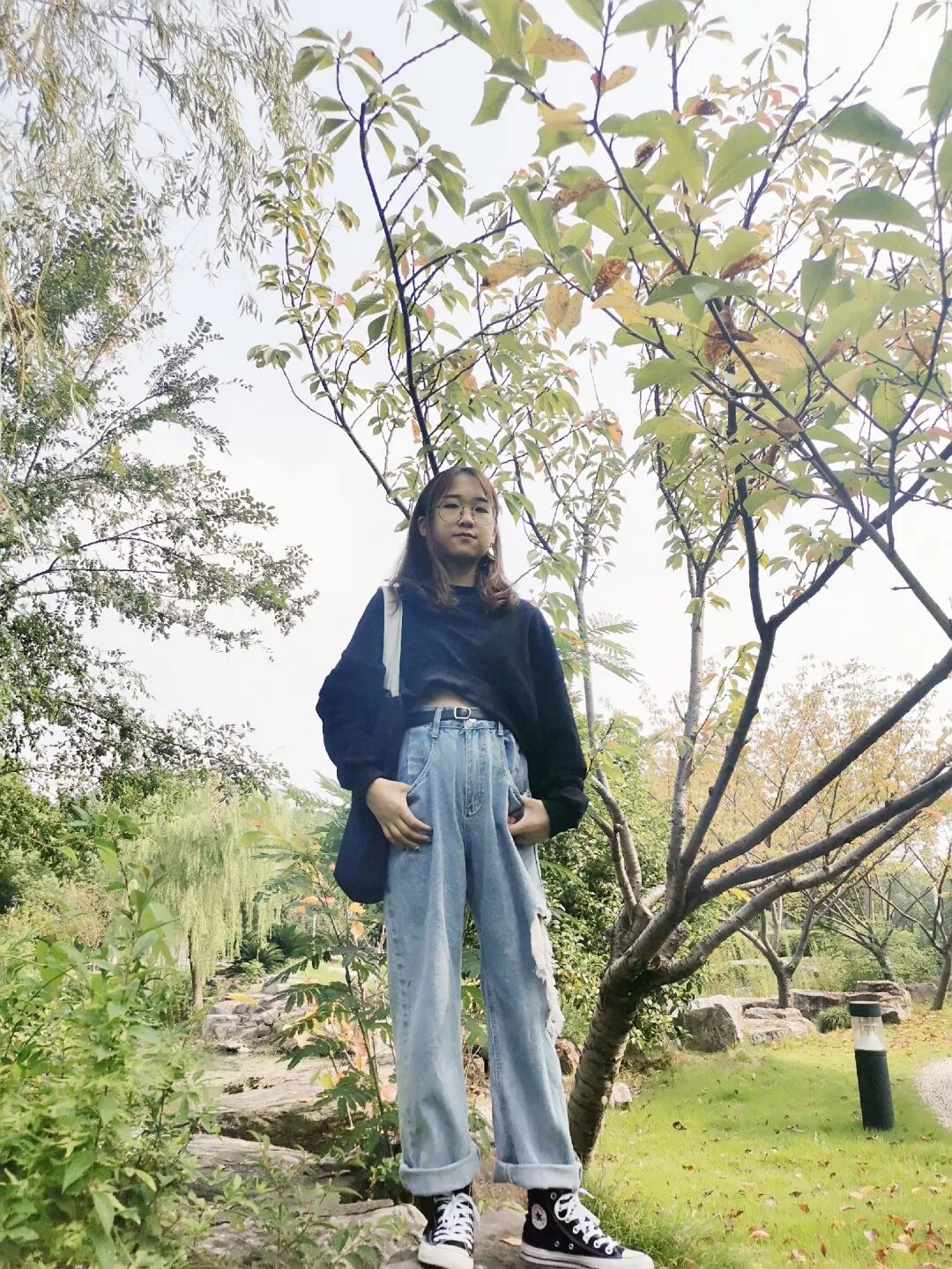 黑色短卫衣+牛仔阔腿裤+黑色匡威高帮+黑色挎包