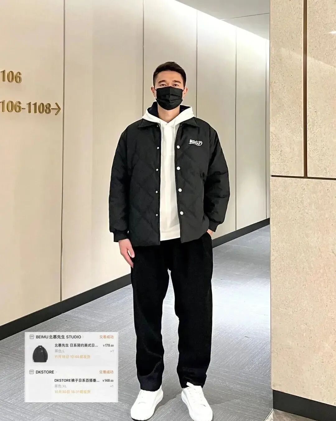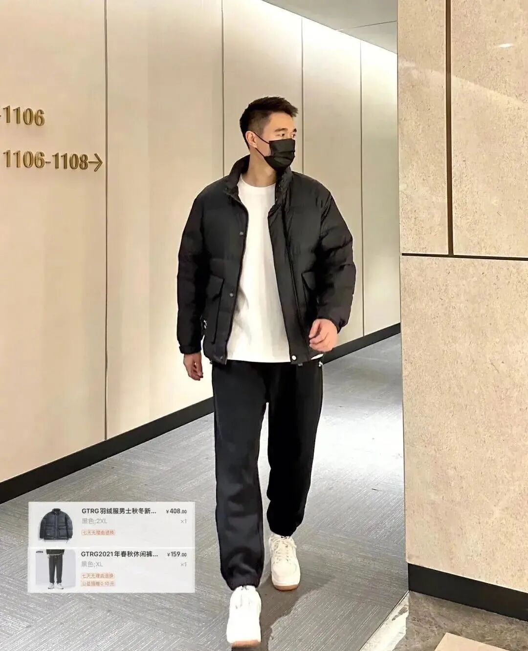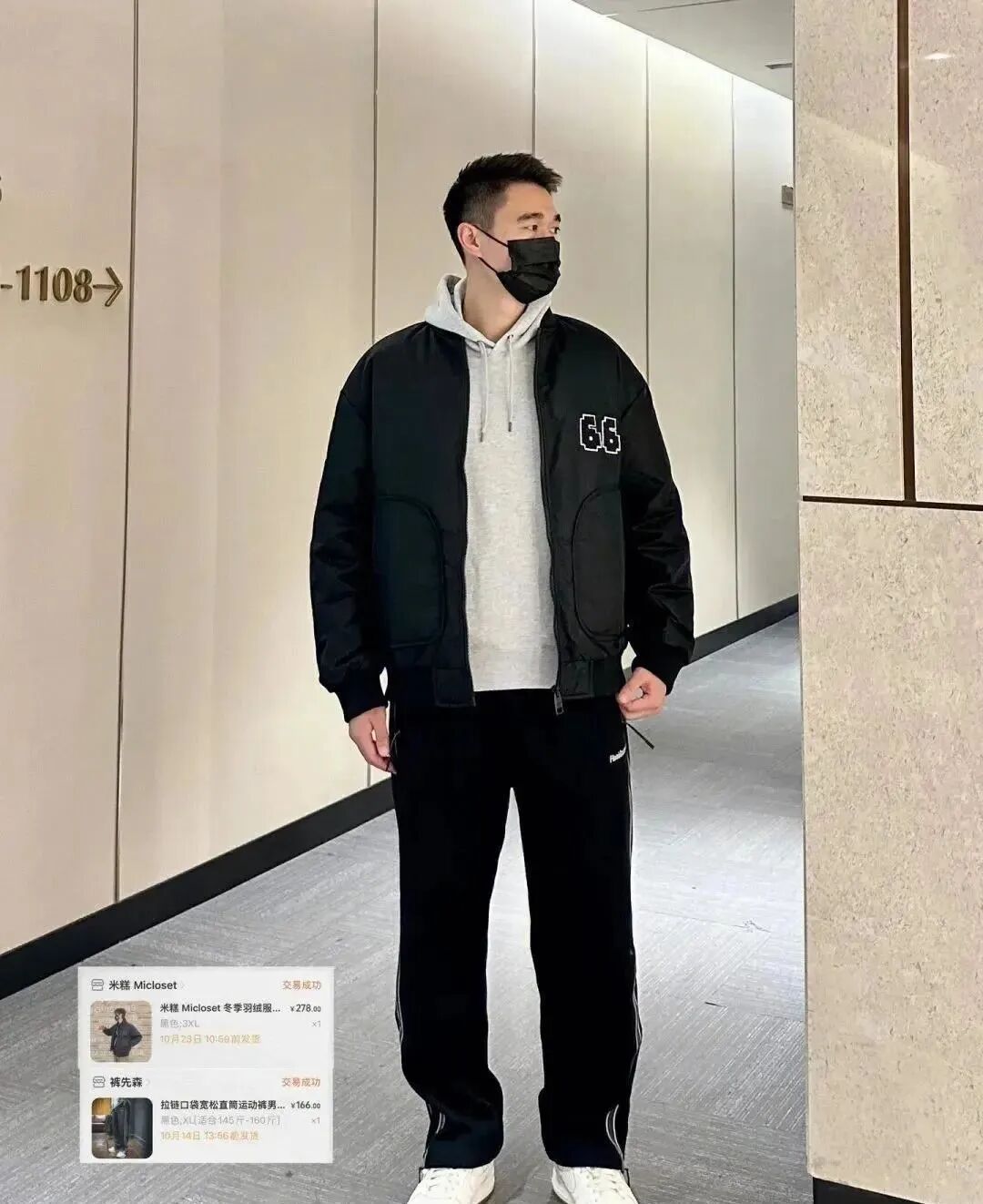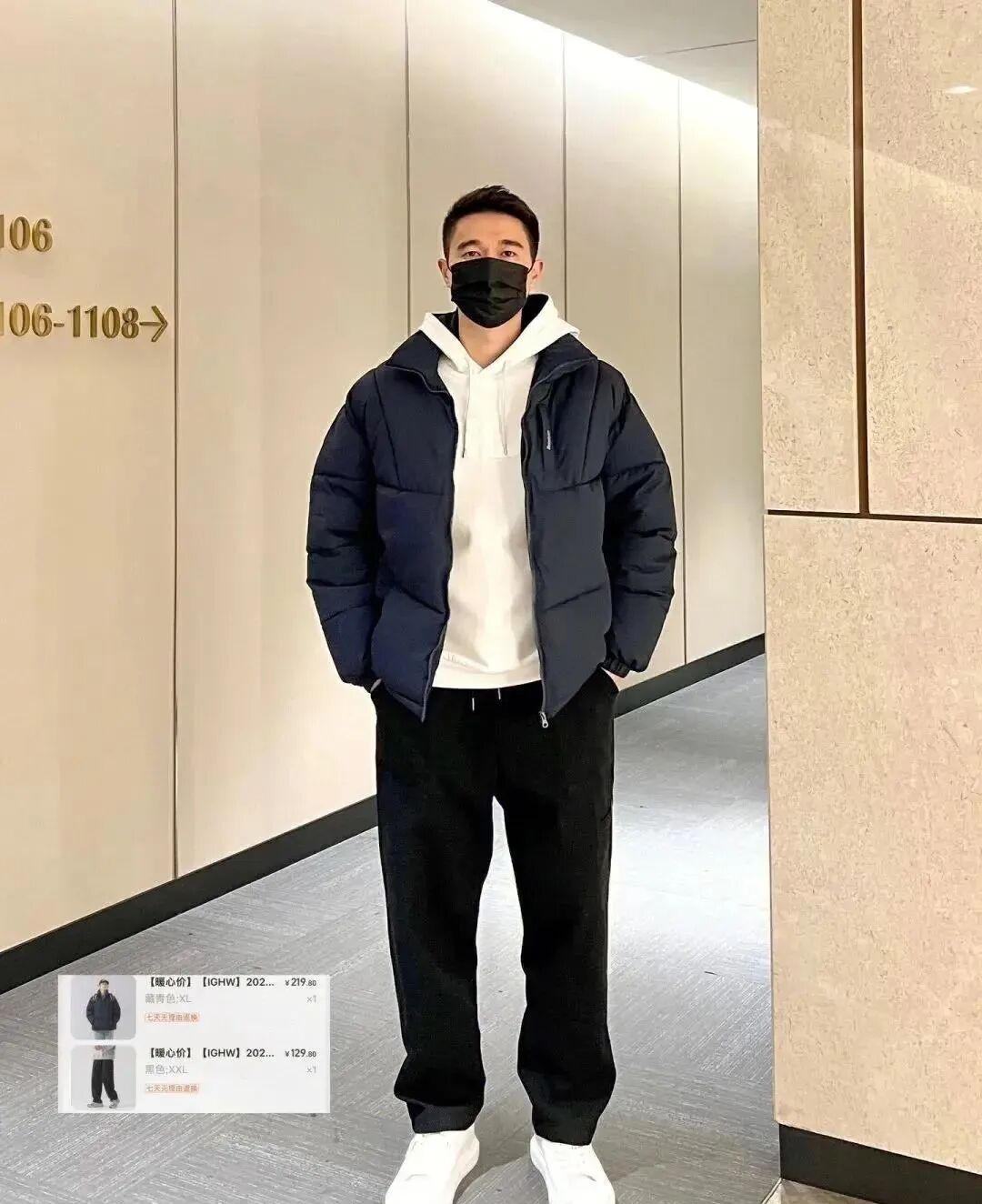 黑色棒球领羽绒服+连帽卫衣+黑色直筒休闲裤;