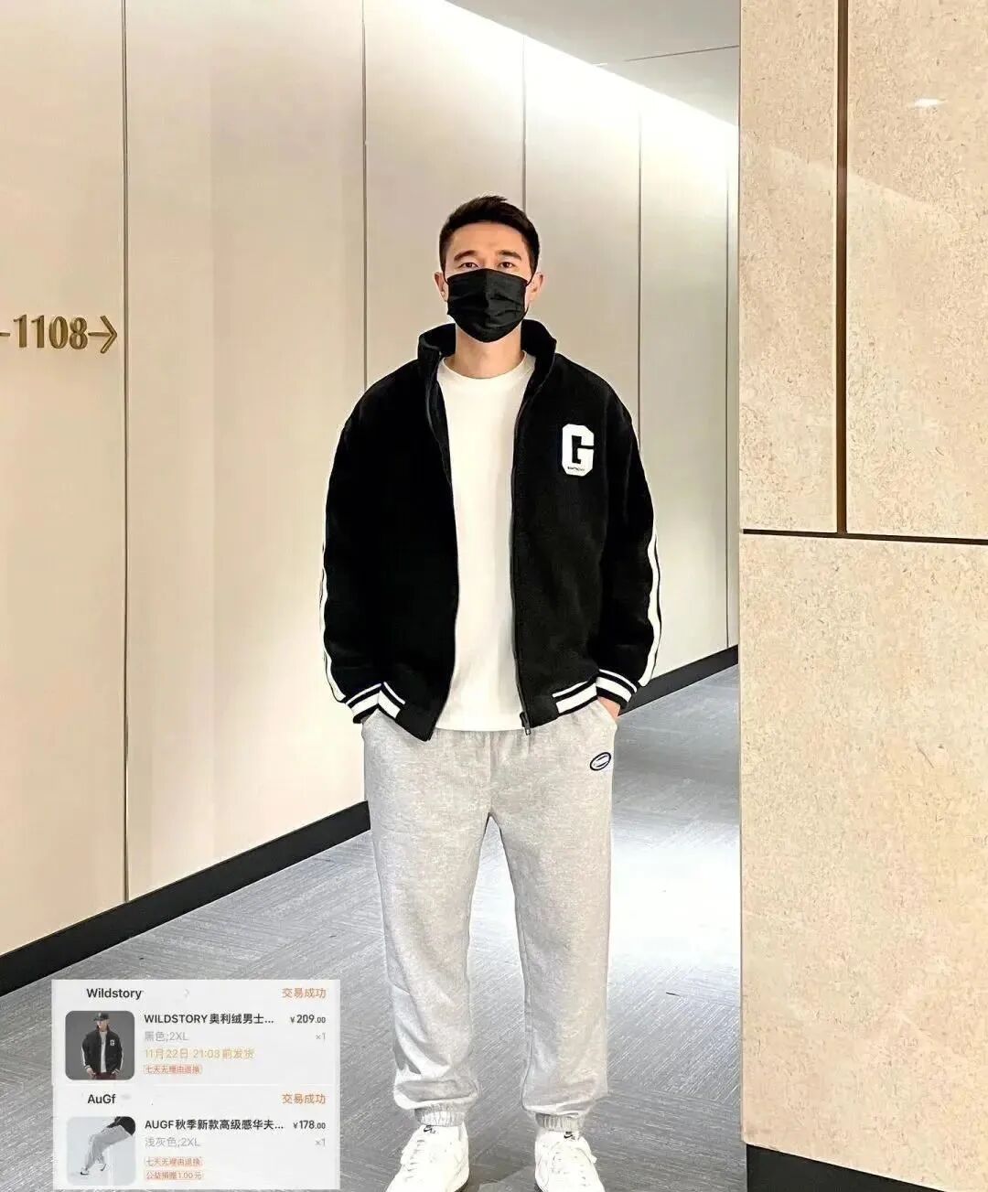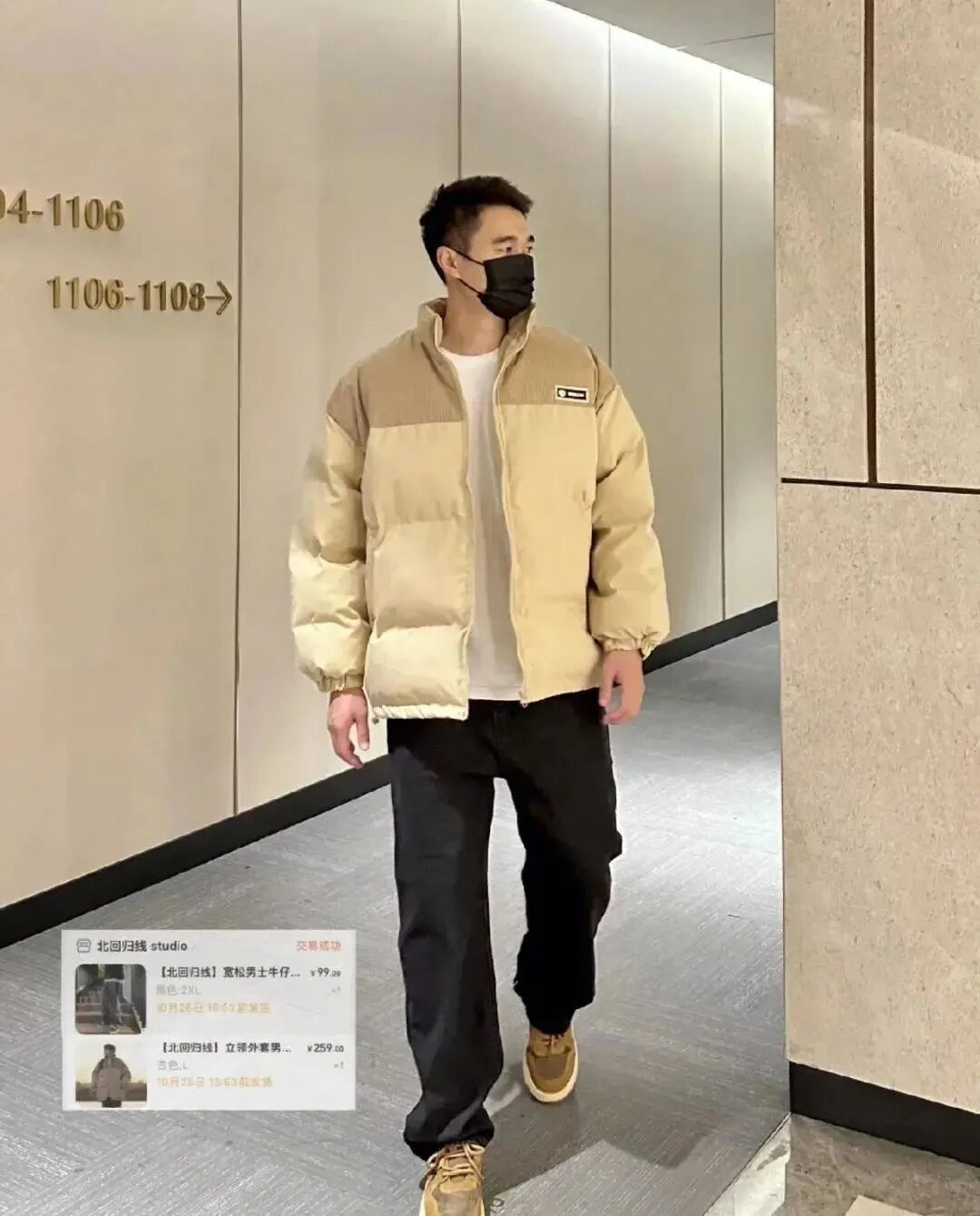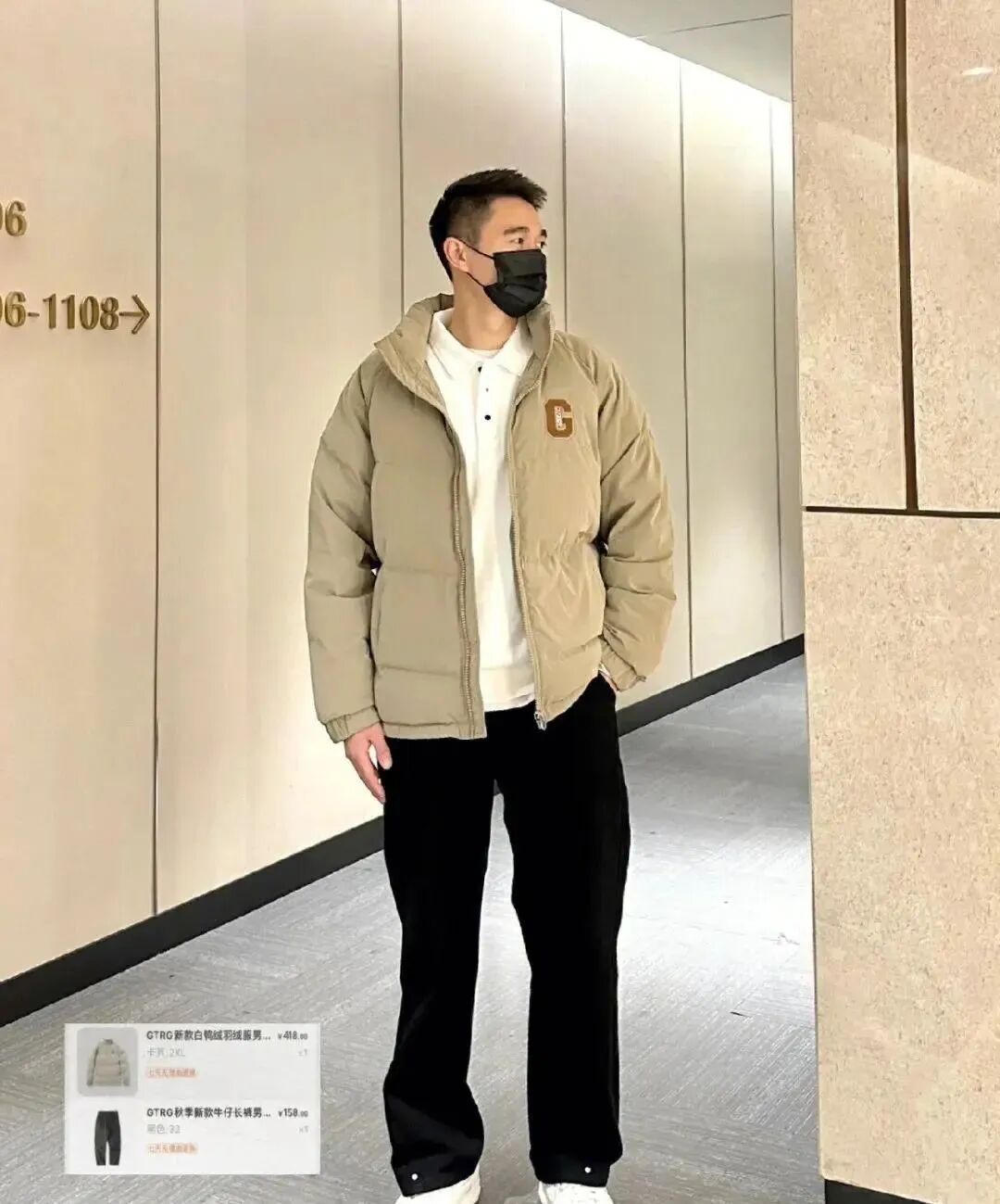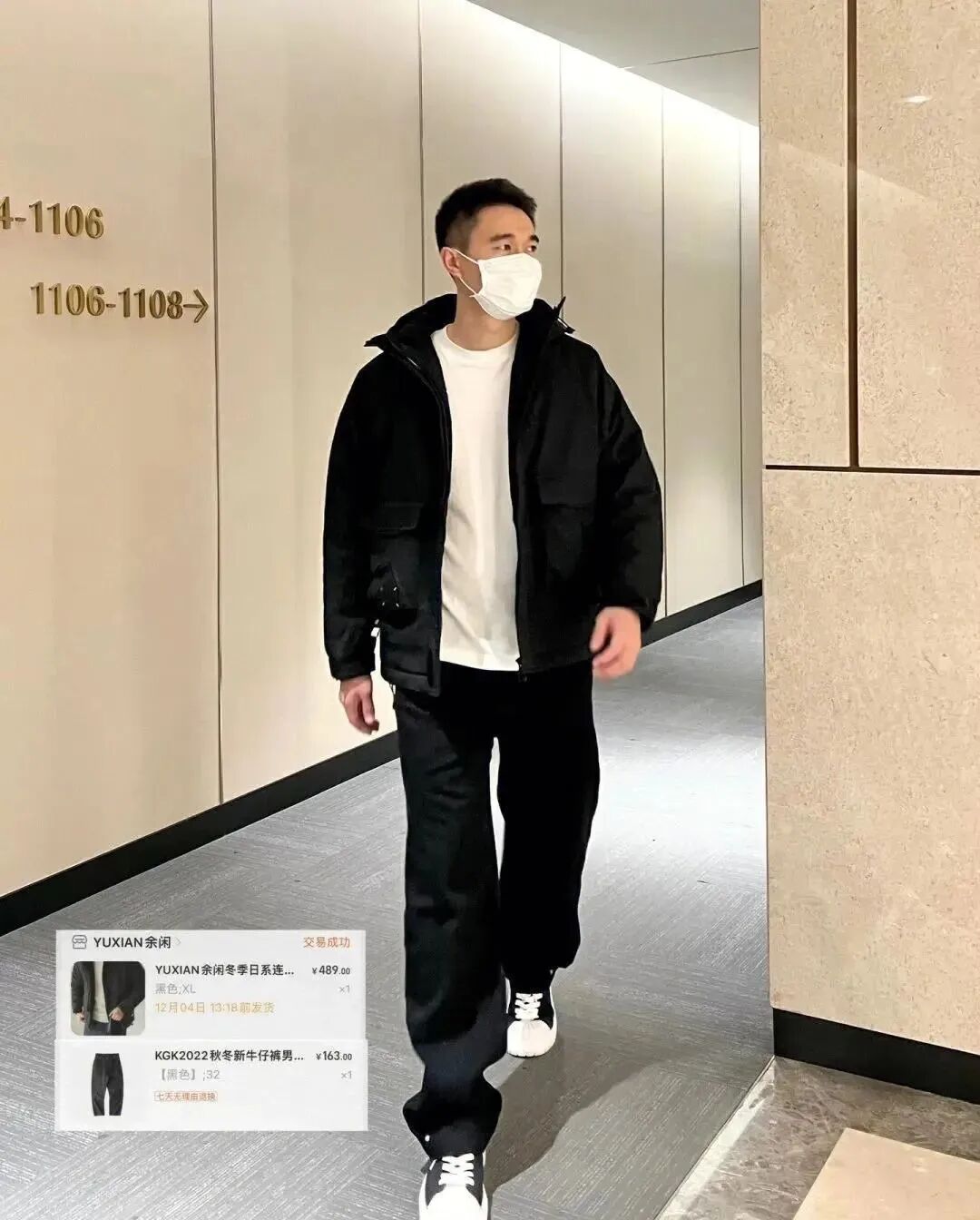 黑色棒球领羽绒服+连帽卫衣+黑色直筒休闲裤;