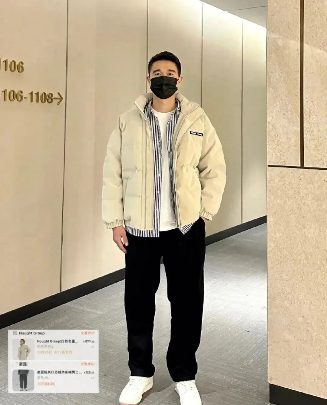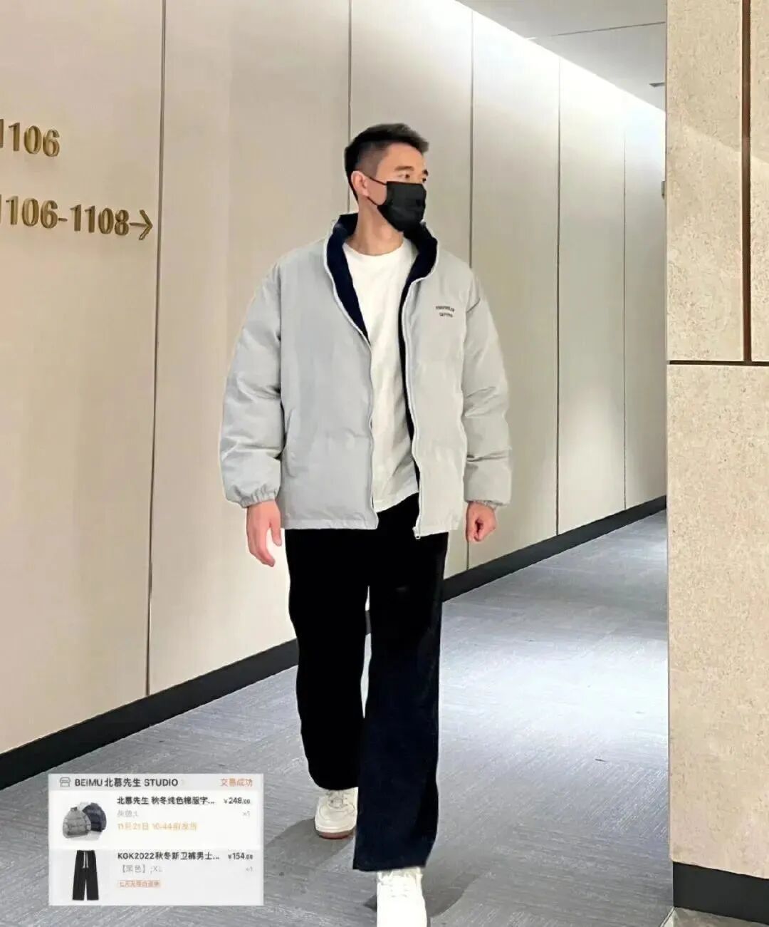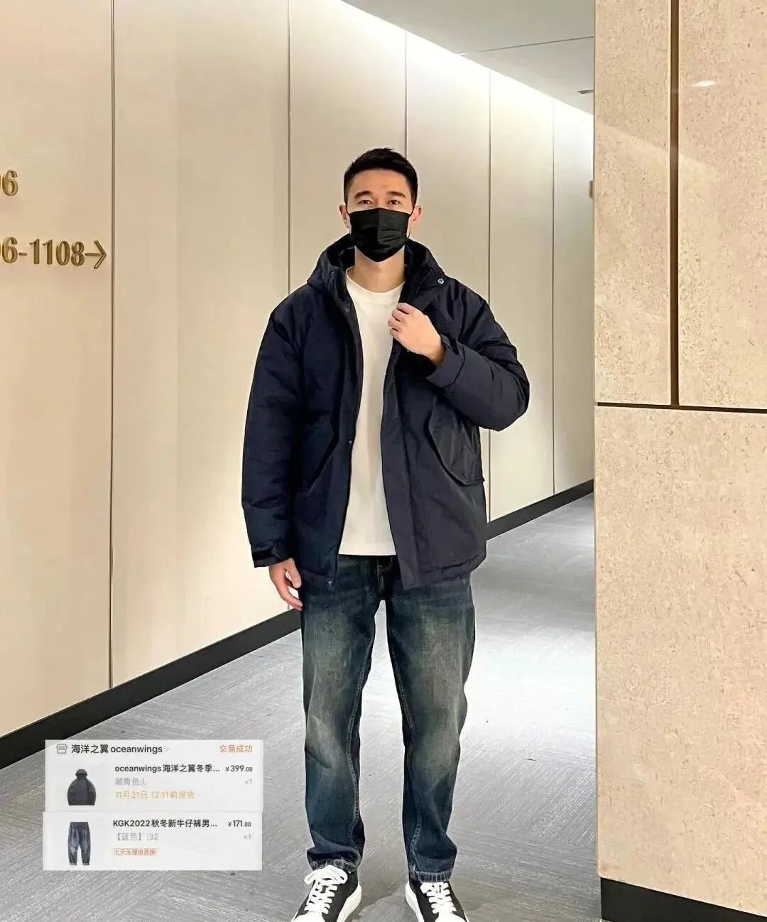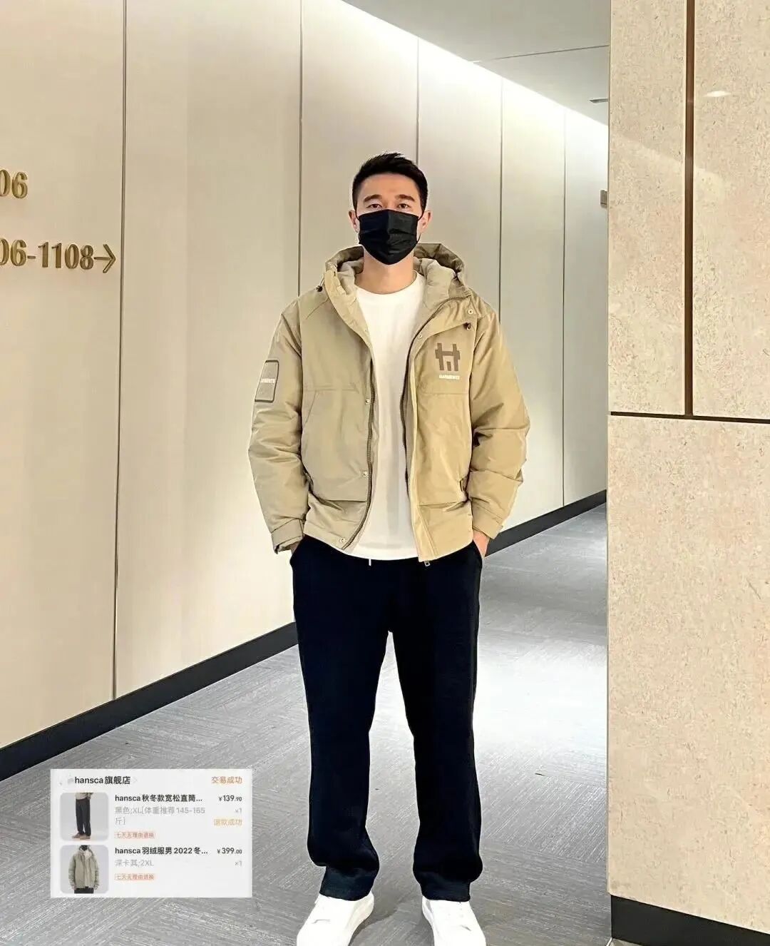 黑色棒球领羽绒服+连帽卫衣+黑色直筒休闲裤;