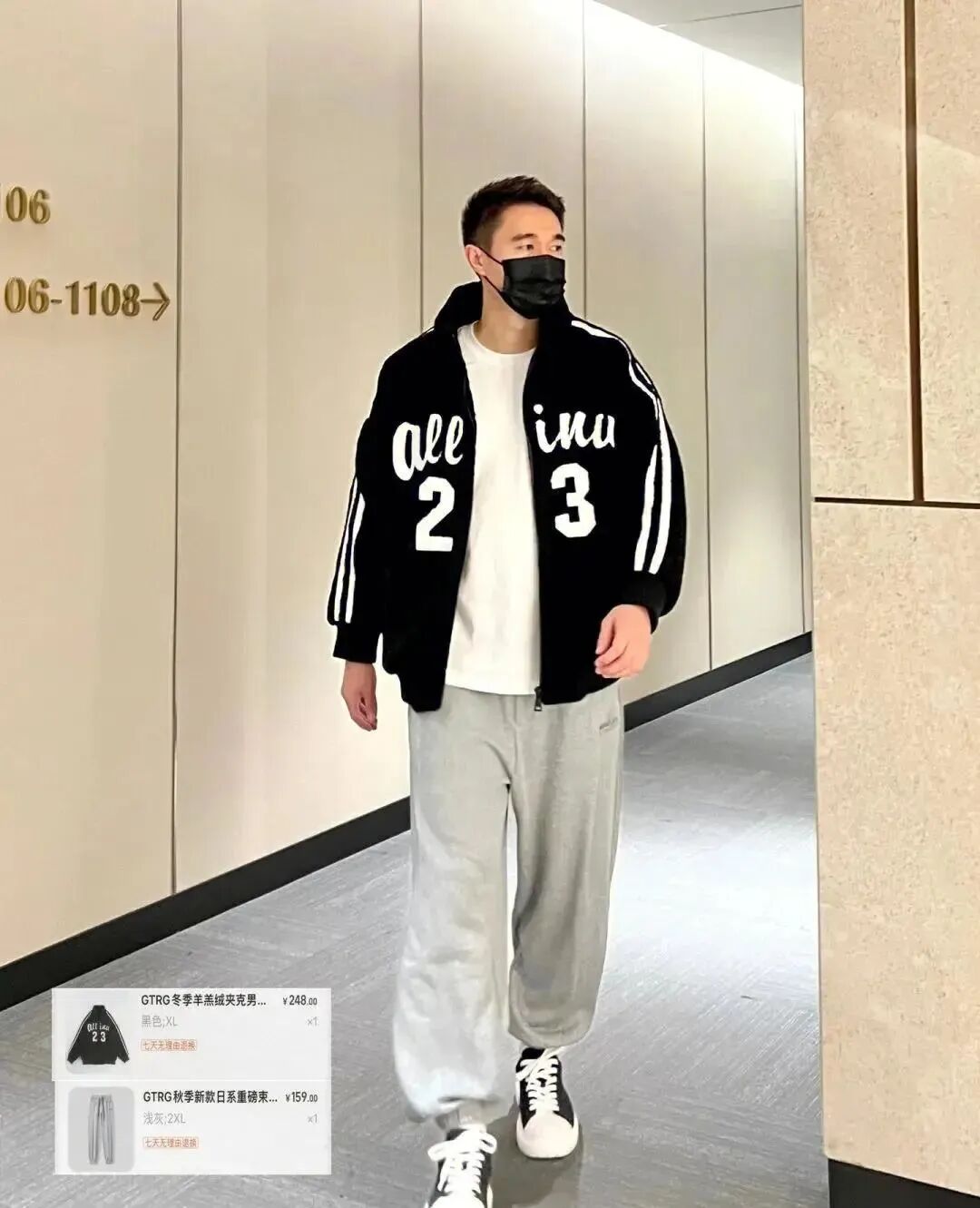 羊毛糕夹克外套+白色打底衫+浅灰色束脚运动裤,黑白灰经典的搭配;