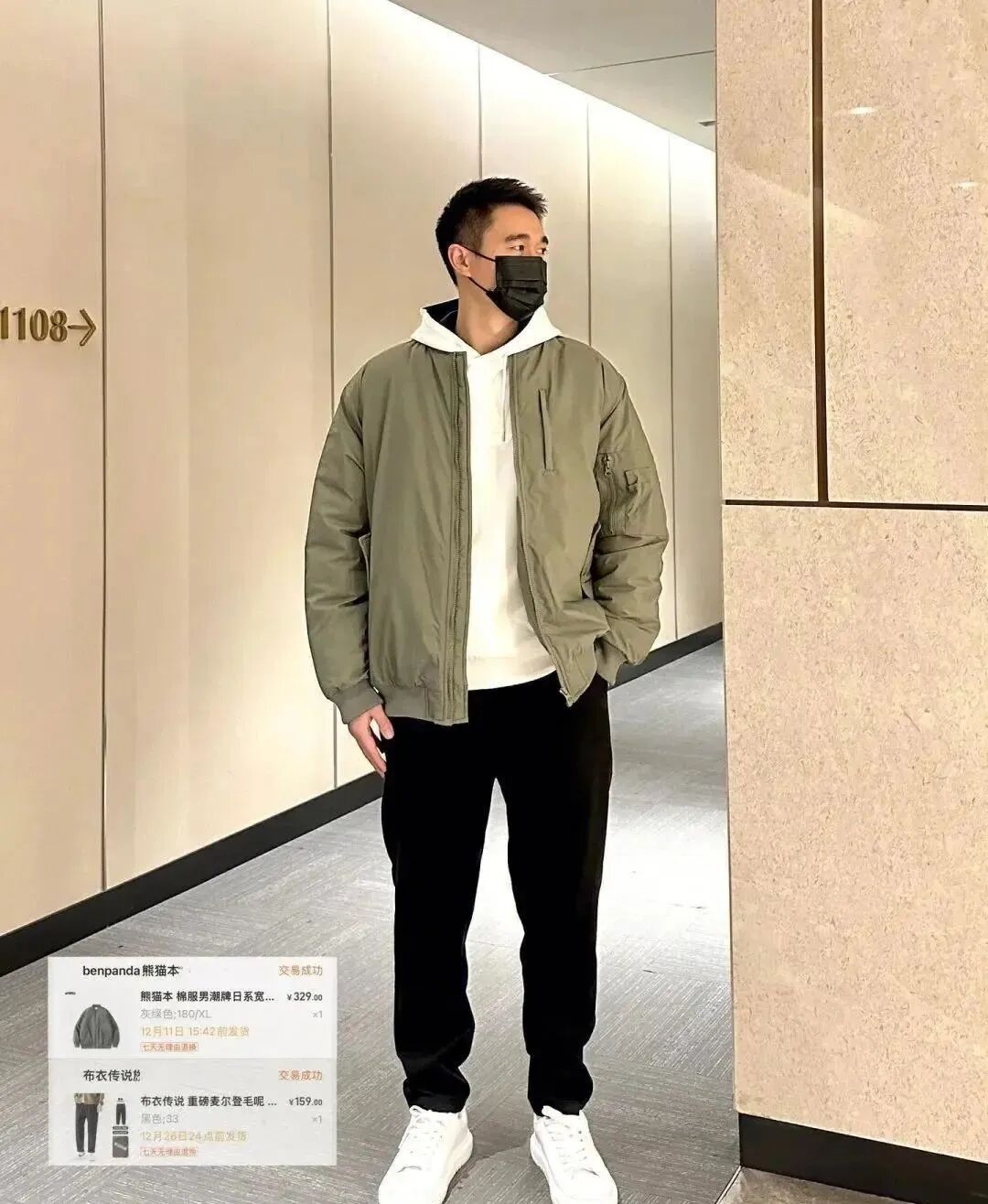 灰绿色飞行员夹克棉服+叠穿卫衣+黑色直筒裤,显瘦又保暖!