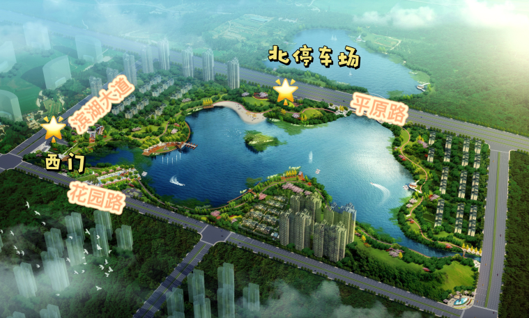 滨湖大道与花园路交叉口北向,是我们的西广场,旁边就是停车场,从这里到共享露营区更方便哦。