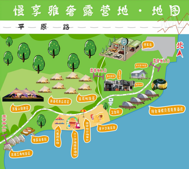 沿着平原路走,会看到我们的北停车场,从这里下去,离平原湖慢享雅奢露营基地很近哦。