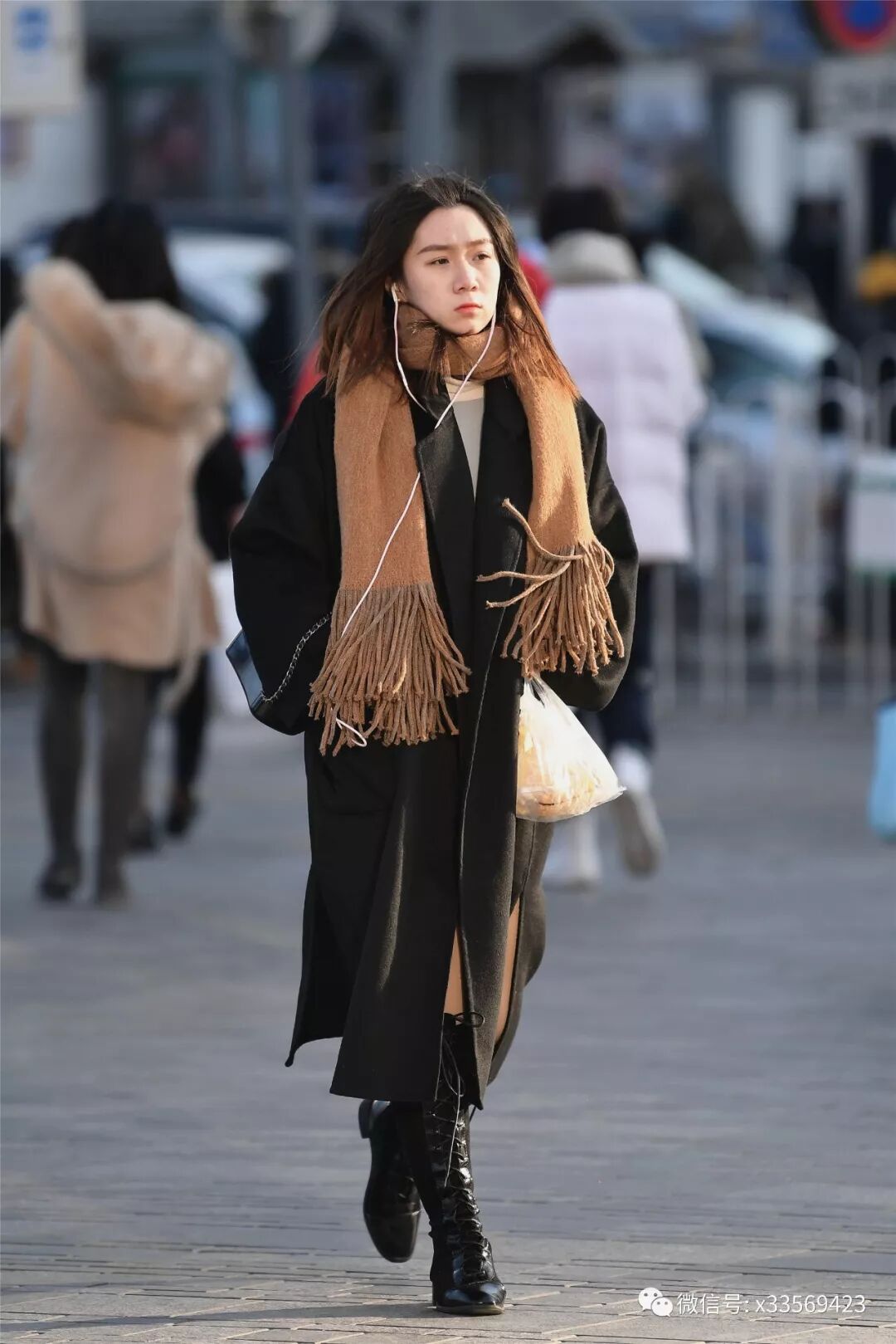 当然也有会为自己搭配的非常暖和的姑娘,一身黑色搭配的非常精彩,腰间的宽腰带水钻设计非常漂亮,袖口也是同样的设计,黑色帽子和黑色长靴搭配在一起,脖领处的彩色围巾,为自己增添不少亮色。