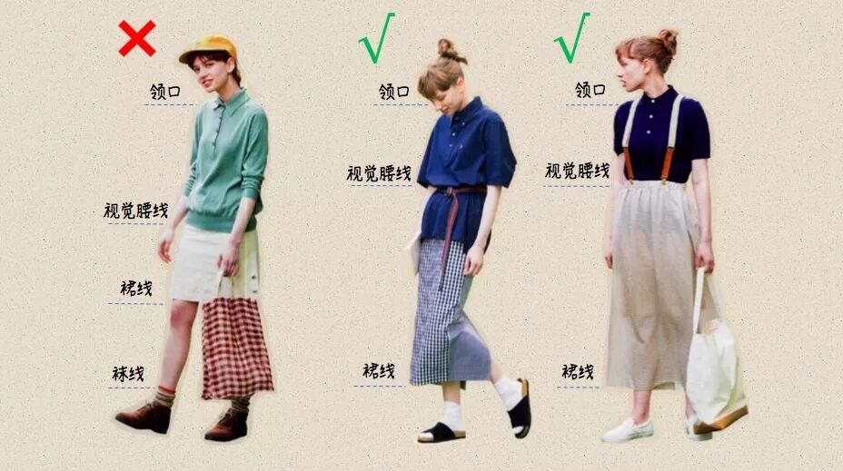 腰线高才是真的高。特别对于个头矮小的妹纸,通过一些穿着上的小技巧,比如说把衣摆扎进下装的手法,让你在视觉上显高。通过图中的对比可以明显看到,衣服下摆过长且垂在裙子外面,不但腰线明显下移,而且腰部的衣服松散拖沓,特别没型,“老头衫”也不过如此。