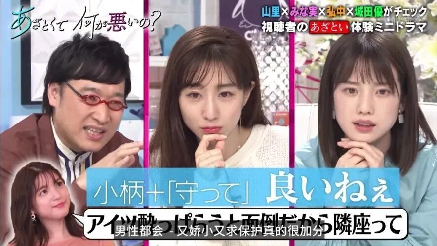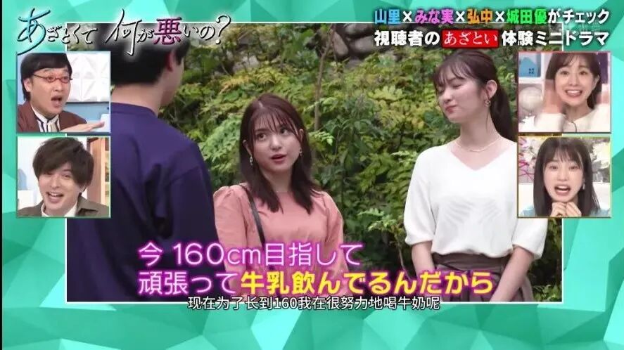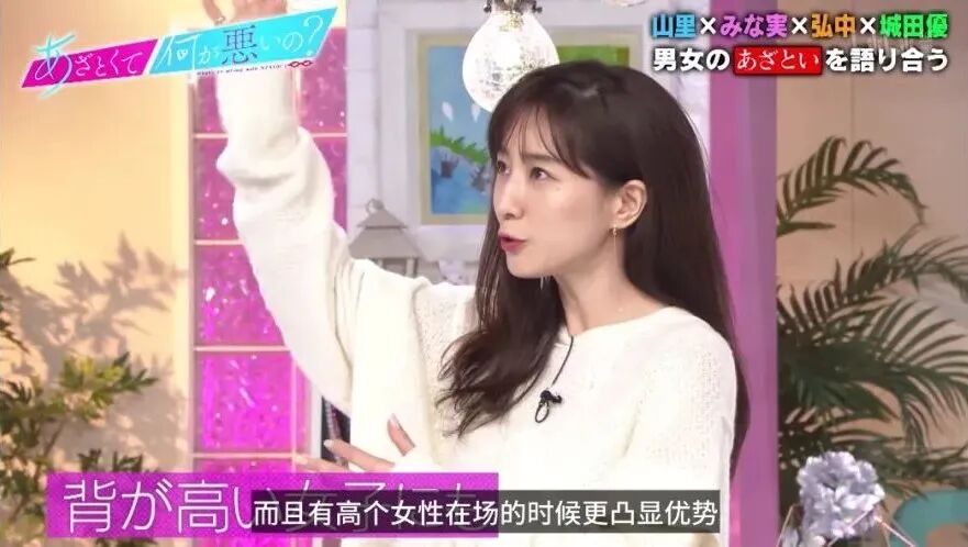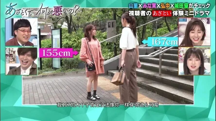 小个子代表田中美奈实和弘中绫香纷纷表示那当然!尤其是和高个子女生在一起的时候,还能撒娇表示“哎呀我也好想跟你那么高呢”,但其实内心并不会这么想。