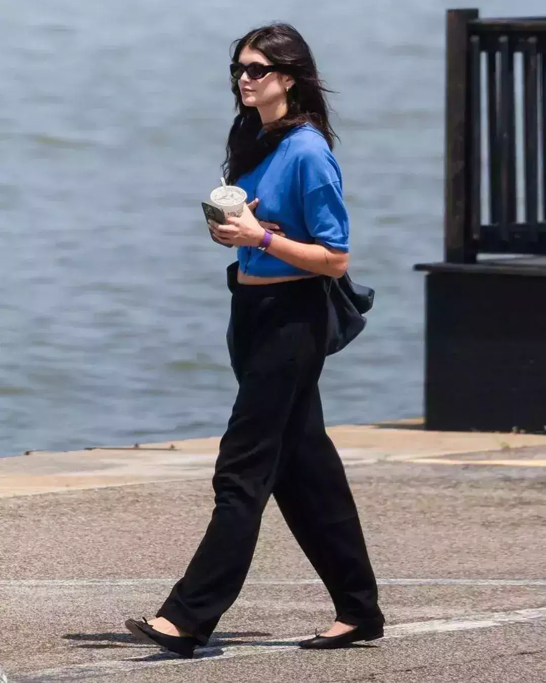 第三套穿搭中,Kaia Gerber选择了Brandy Melville的系带运动裤和James Street Co的蓝色开衫,搭配芭蕾鞋和黑色太阳镜,展现出一种随性而不失格调的休闲风格。