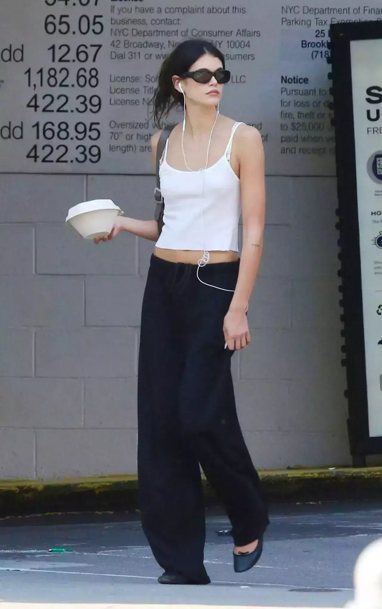 第一套穿搭中,Kaia Gerber以白色吊带背心搭配黑色抽绳运动长裤,脚踏一双经典的黑色芭蕾鞋,简约而不失优雅。