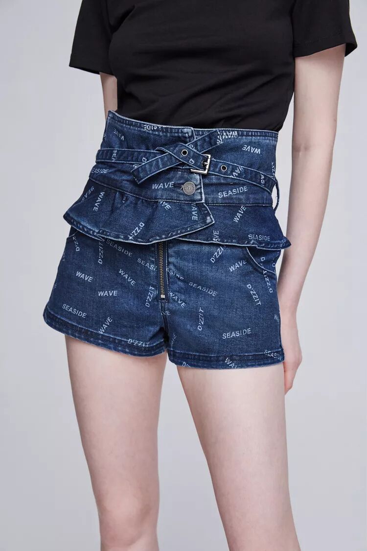 dzzit 字母印花高腰荷叶边牛仔短裤