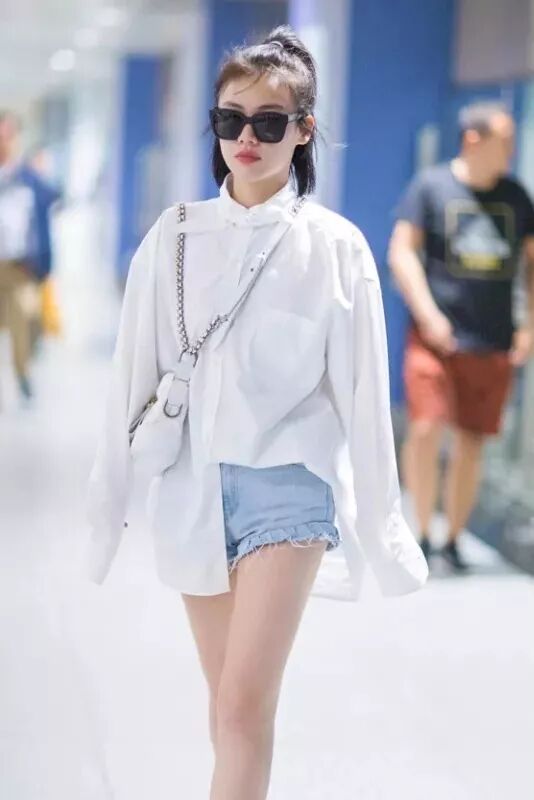 很多女明星的私服、街拍都用牛仔短裤来搭配。江疏影偏爱白色的牛仔短裤,而不管是混搭风还是运动风都能轻松hold住。