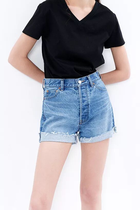 斜边牛仔短裤,与平角的裤型相比,在视觉上有一种向上提升的效果,一个小细节也能让腿部变得更为挺拔修长。